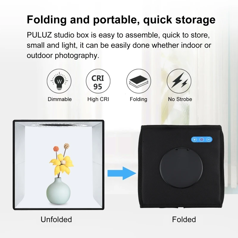 3. Easy to assemble (real three seconds to assemble and use), you can unfold this LED light box shed and place it on any surface to get a good background for commercial photography of small items and take pictures of the product.