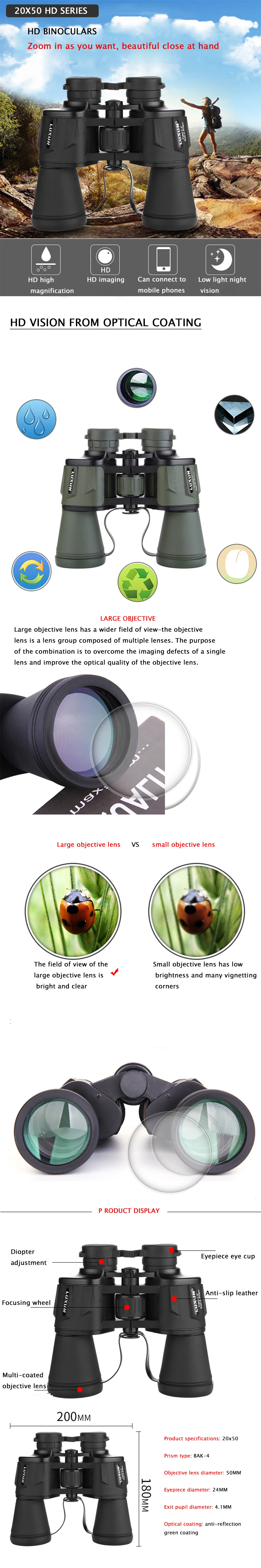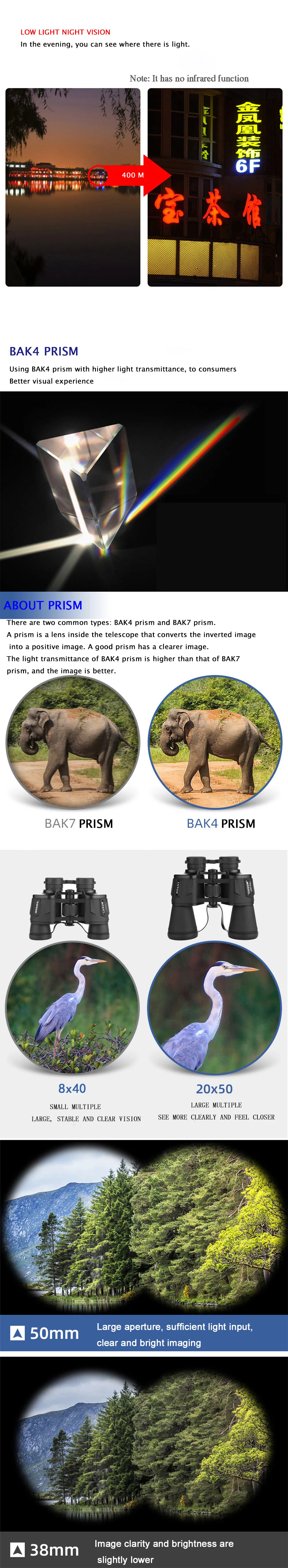 -20x50 мощный бинокль. -Полностью Покрытые линзы обеспечивают максимальный светильник и оптимальную яркость. -Сверхнизкое дисперсионное стекло корректирует хроматическую аберрацию, которая вызывает окантовку цвета и реализует насыщенное контрастным и высоким разрешением изображение. -Четкие и четкие изображения на периферию объектива, благодаря эксклюзивному дизайну линз и окуляра. -Полностью Покрытые линзы обеспечивают максимальный светильник и оптимальную яркость.