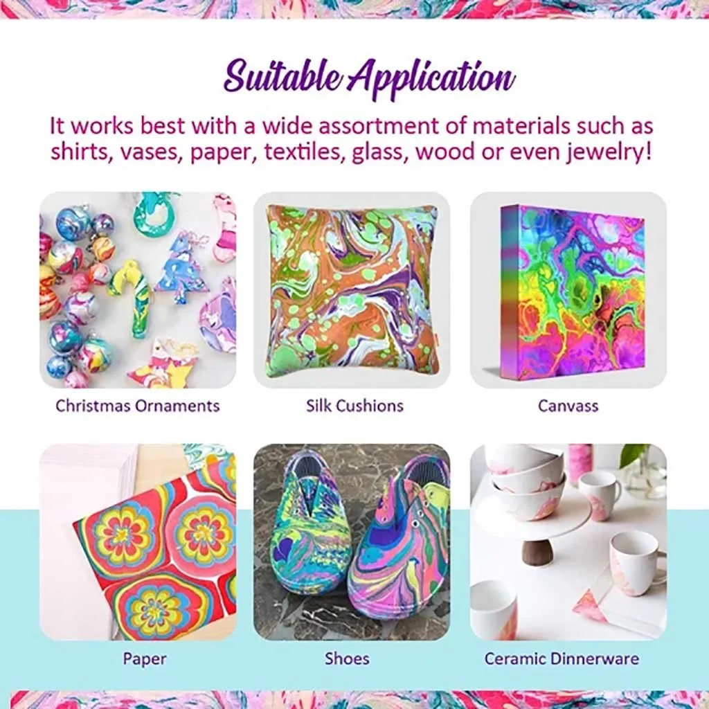 Вы можете Преобразуйте любой тип материала, чтобы создать свои собственные узоры, принты и Дизайн. Практически все материалы, которые впитывают воду, могут быть мраморными Эти чернила, такие как бумага, ткань и дерево.