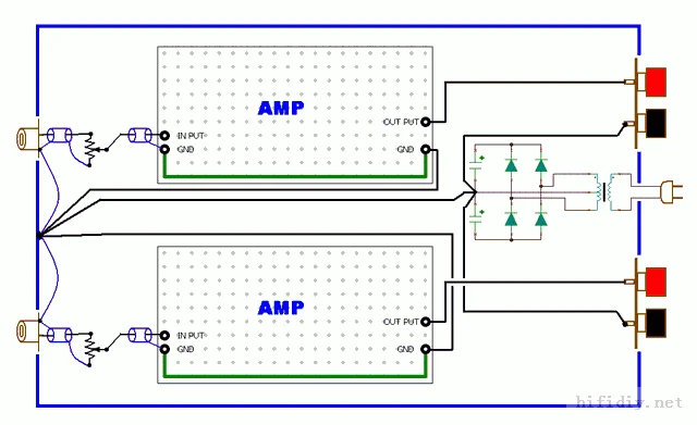 Положительный и отрицательный выход 38 в может быть подключен к усилителю мощности класса А, например PASSA3, A5, с защитой от короткого замыкания и перегрузки по току, а также усилителю мощности Защита от среднего напряжения, что может сохранить защитную панель динамика, а усилитель мощности напряжение средней точки аномально отключает выходное напряжение. Структура Цепи 3525 push IR2110, коммутационная трубка использует 50A IRG4PC50W.