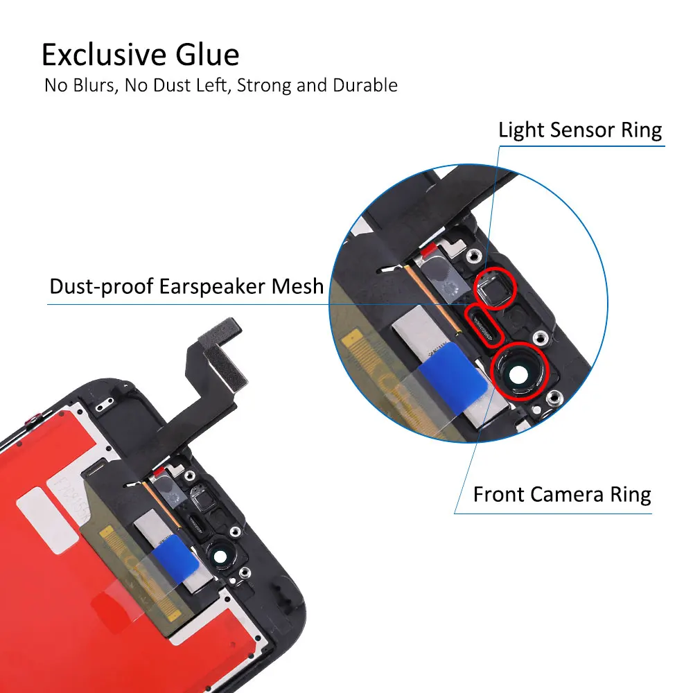 1. Детали: внешнее стекло + ЖК-экран + сенсорная панель дигитайзера + Переднее кольцо для камеры + Датчик-светильник + Пыленепроницаемая сетка для ушей, предварительно собранная.