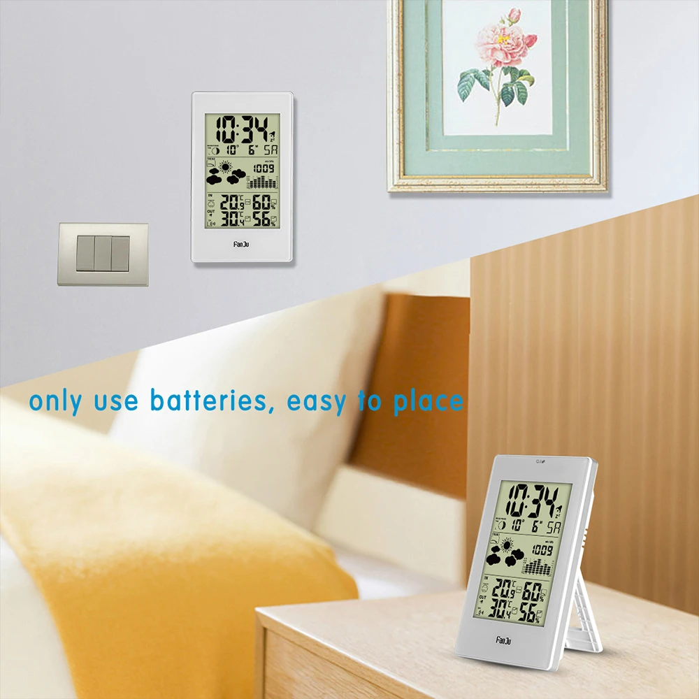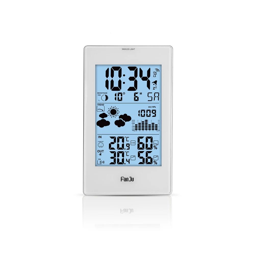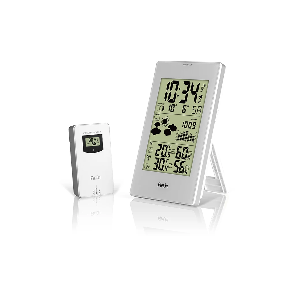 Погодная станция с беспроводным наружным датчиком для измерения температуры, влажности, атмосферного давления и имеет функции цифровых часов, календаря, будильника и повтора, его ЖК-экран также отображает фазу Луны, уровень комфорта, тренд температуры, влажности и барометрического измерения.