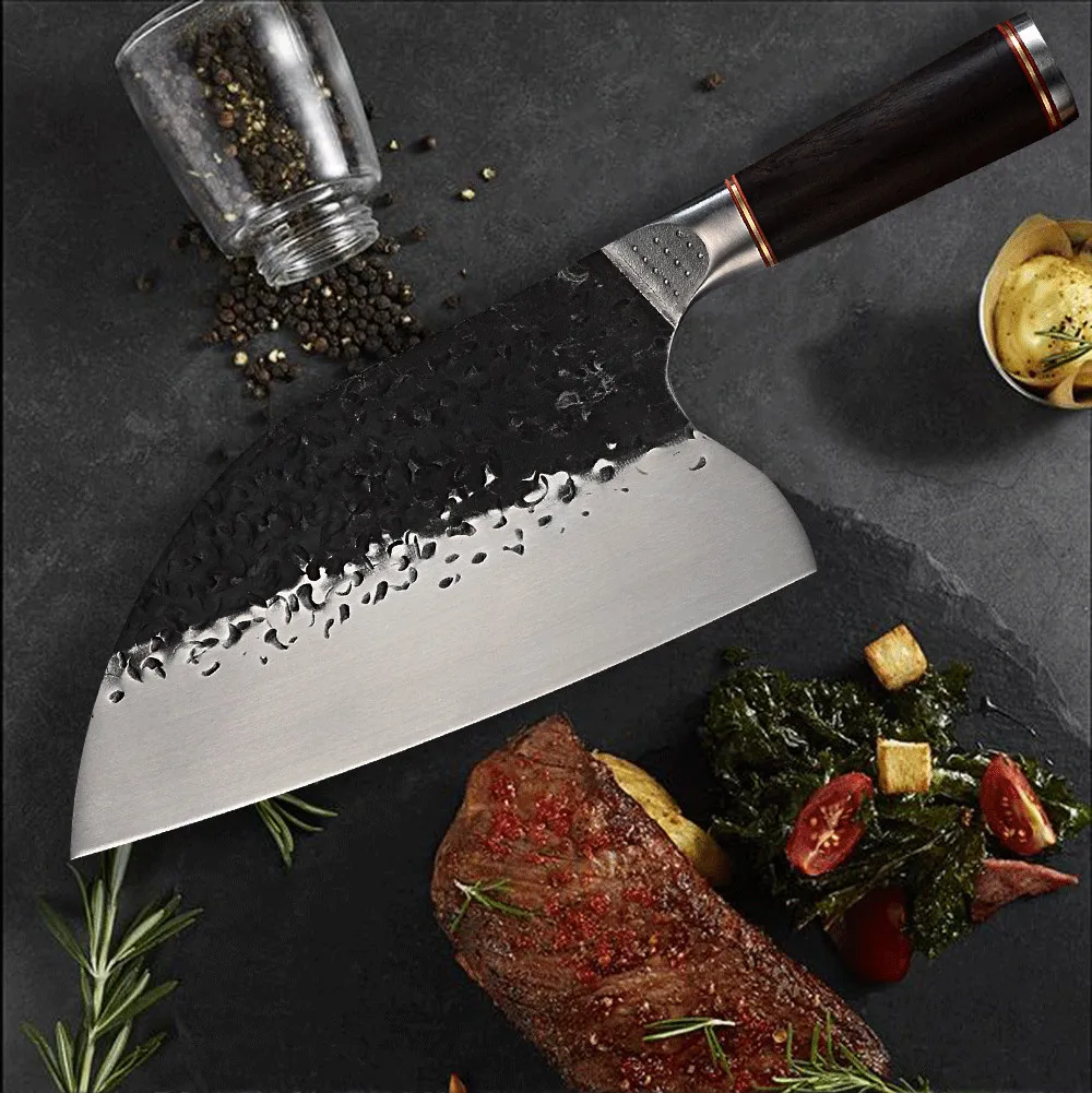 Посылка входит: 1 * нож мясника [Материал лезвия] кованая Высокоуглеродистая сталь ручной работы. [Удобная ручка из черного дерева] медное кольцо усиления, не легко деформируется, не скользит. [Производственный процесс] в закалке-зажиме стали-закалке и других операциях непрерывного цикла.
