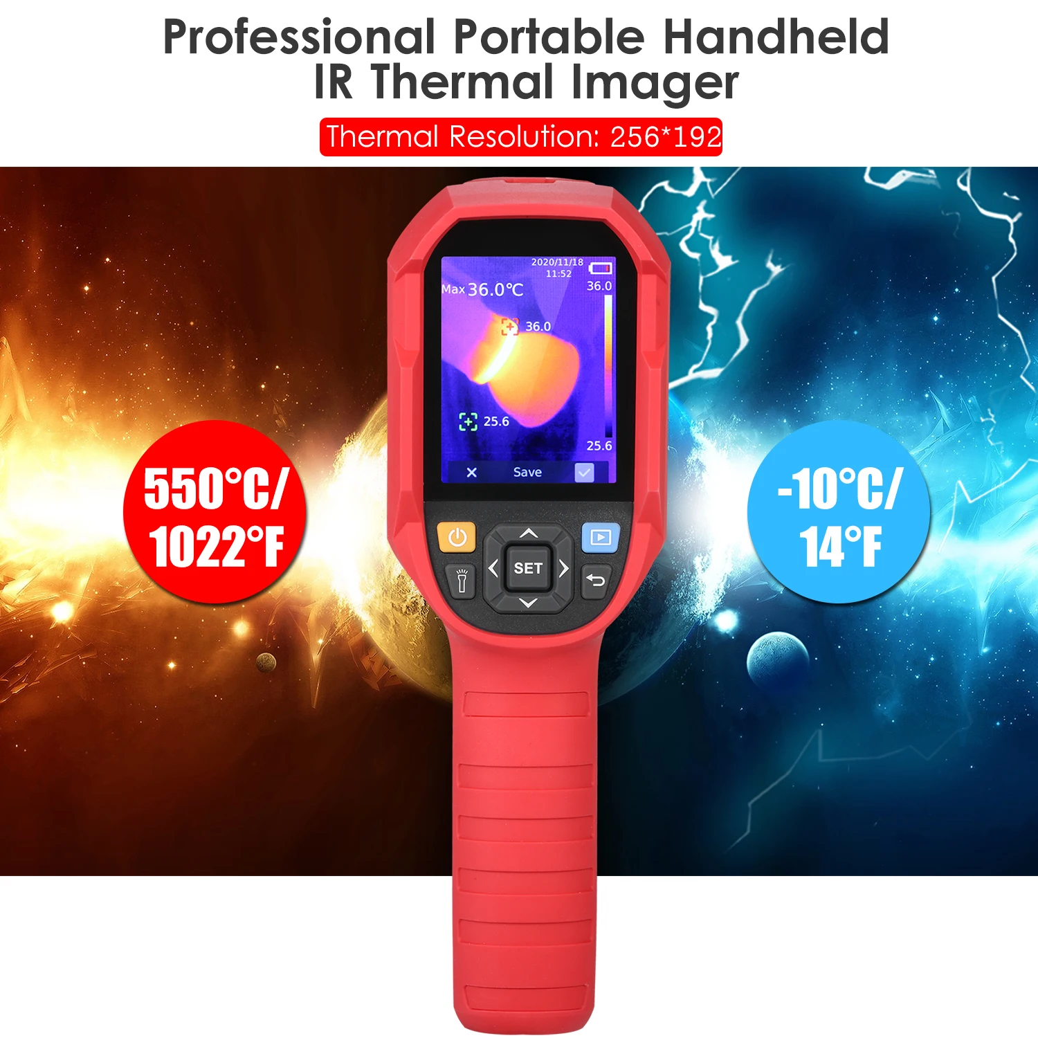 Больше возможностей-Измерение температуры в центре, отслеживание высоких температур, 5 цветовых палитр для выбора, переключение по Цельсию и по Фаренгейту, фонарик.