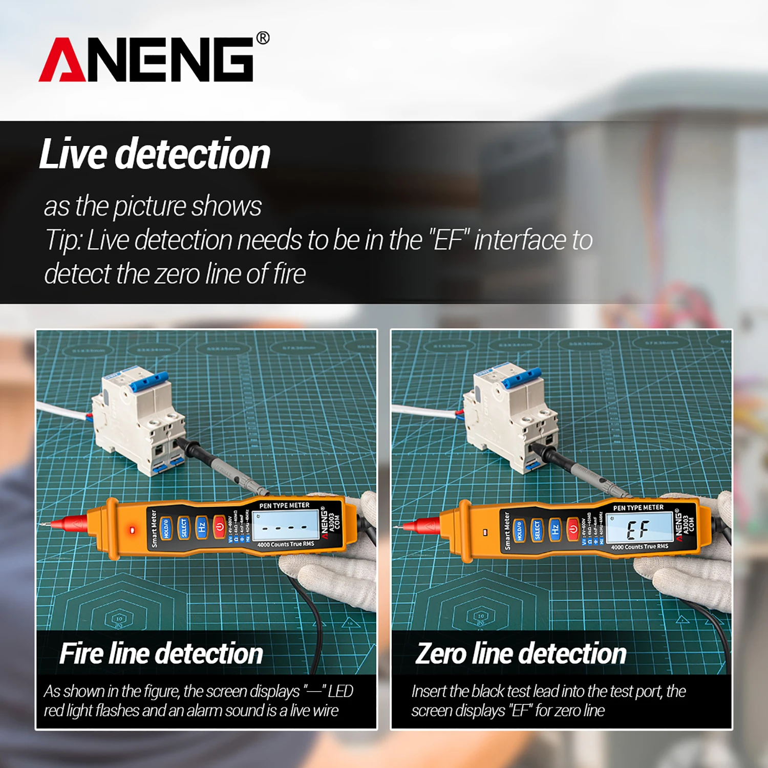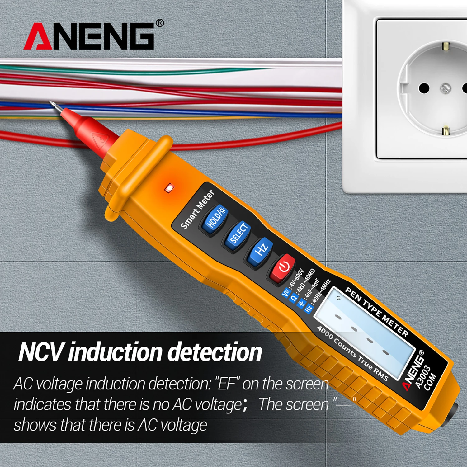 ANENG A3003 4000 отсчетов Ручка Тип Цифровой мультиметр с NCV, AC/DC вольтметр, Омметр, сопротивление, емкость, частота и Тест линии, цифровой мультиметр-ручка также с функцией EF и функцией включения-выключения Buzzer Detection поддерживает Удержание данных. Большой ЖК-экран с поддержкой функции автоматического отключения для энергосбережения; Buit-in flash светильник + звуковой сигнал и светильник, более удобный тест и чтение.