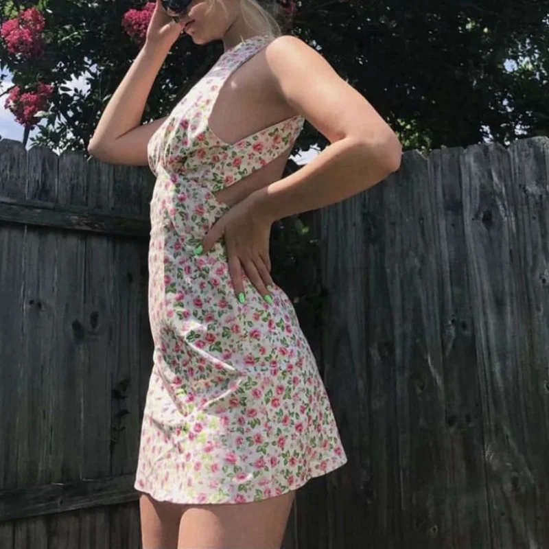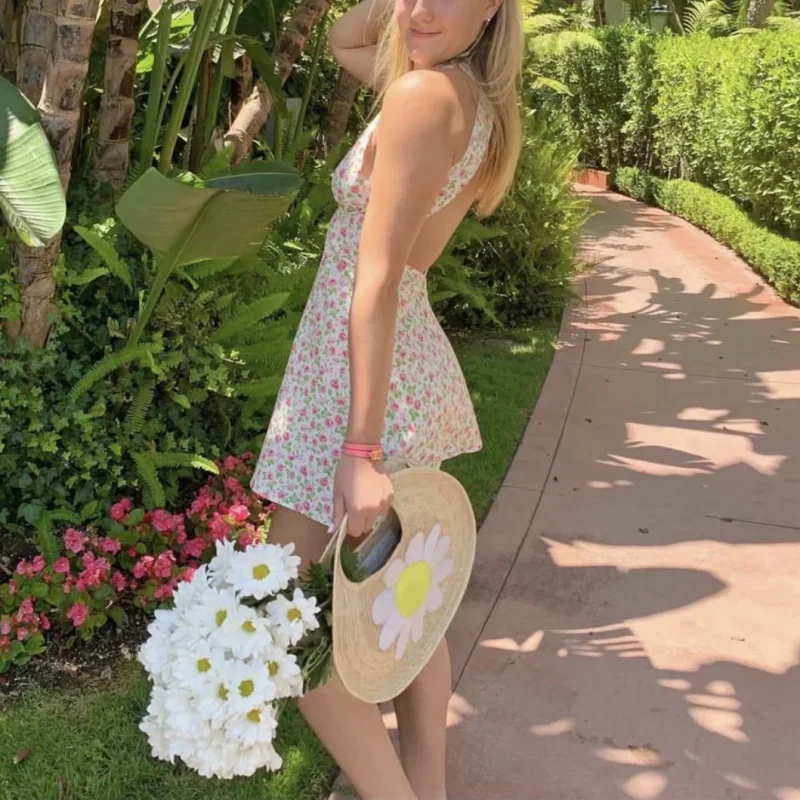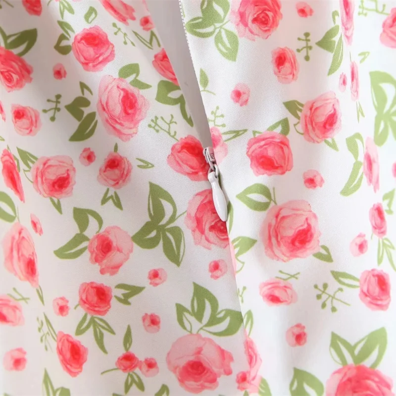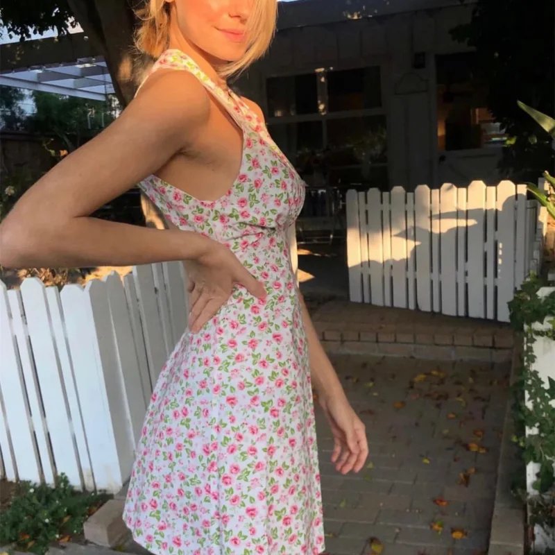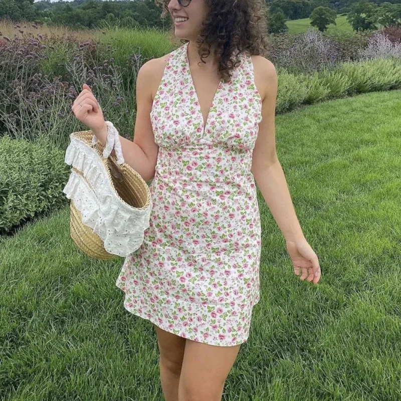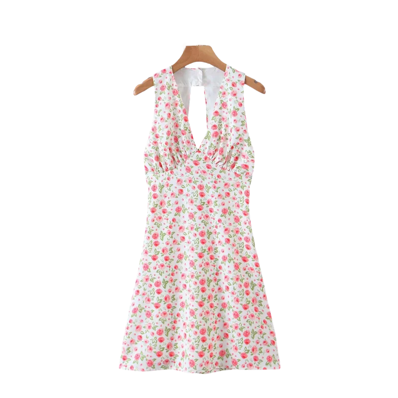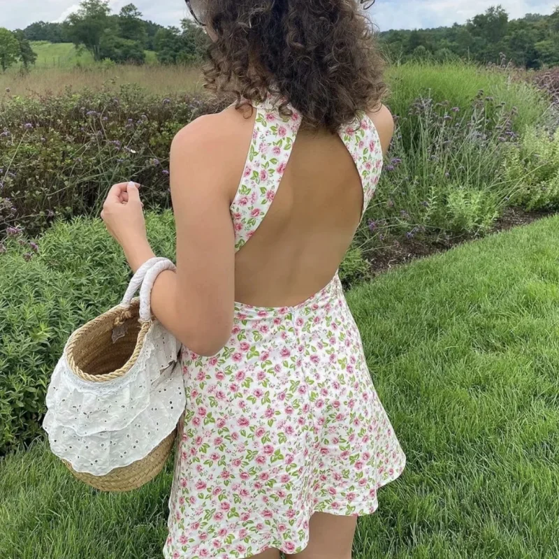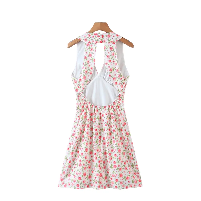 2021 Весна Лето Женское французское тонкое розовое цветочное мини-платье с v-образным вырезом и открытой спиной милые сельские платья без рукавов для отдыха
