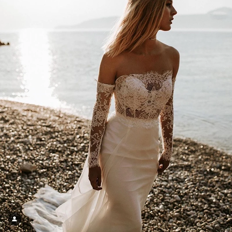 Сексуальные пляжные богемные кружевные свадебные платья с длинными рукавами, свадебные платья без бретелек для невесты с открытой спиной, доступная распродажа
