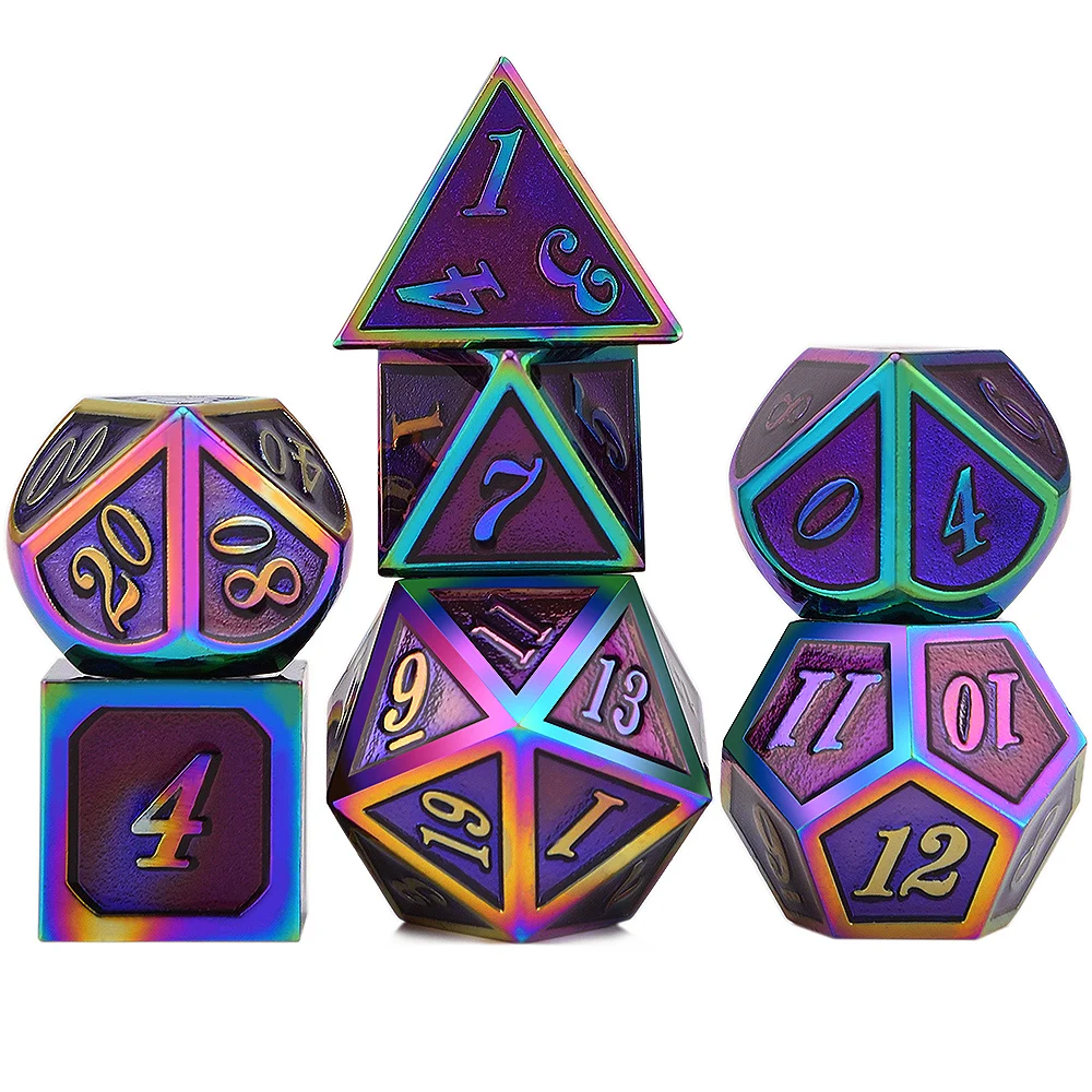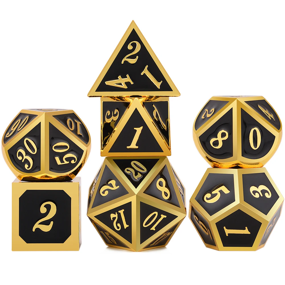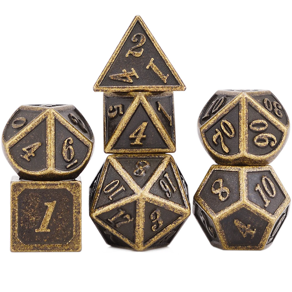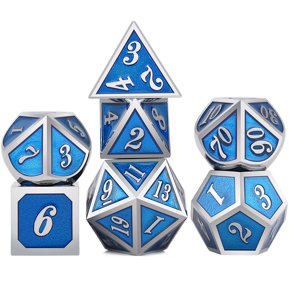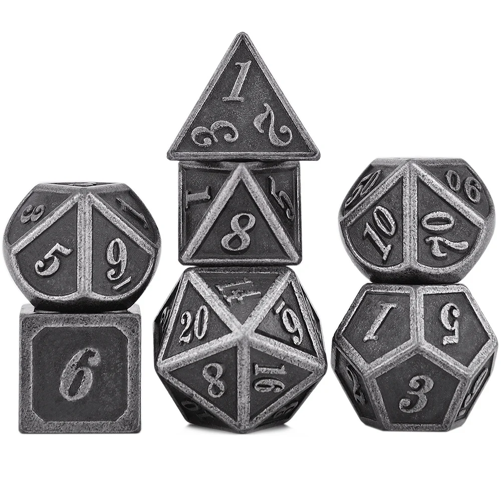 7 металлических многогранных костей содержит один D20, один D12, два D10 (00-90 и 0-9), один D8, один D6 и один D4.