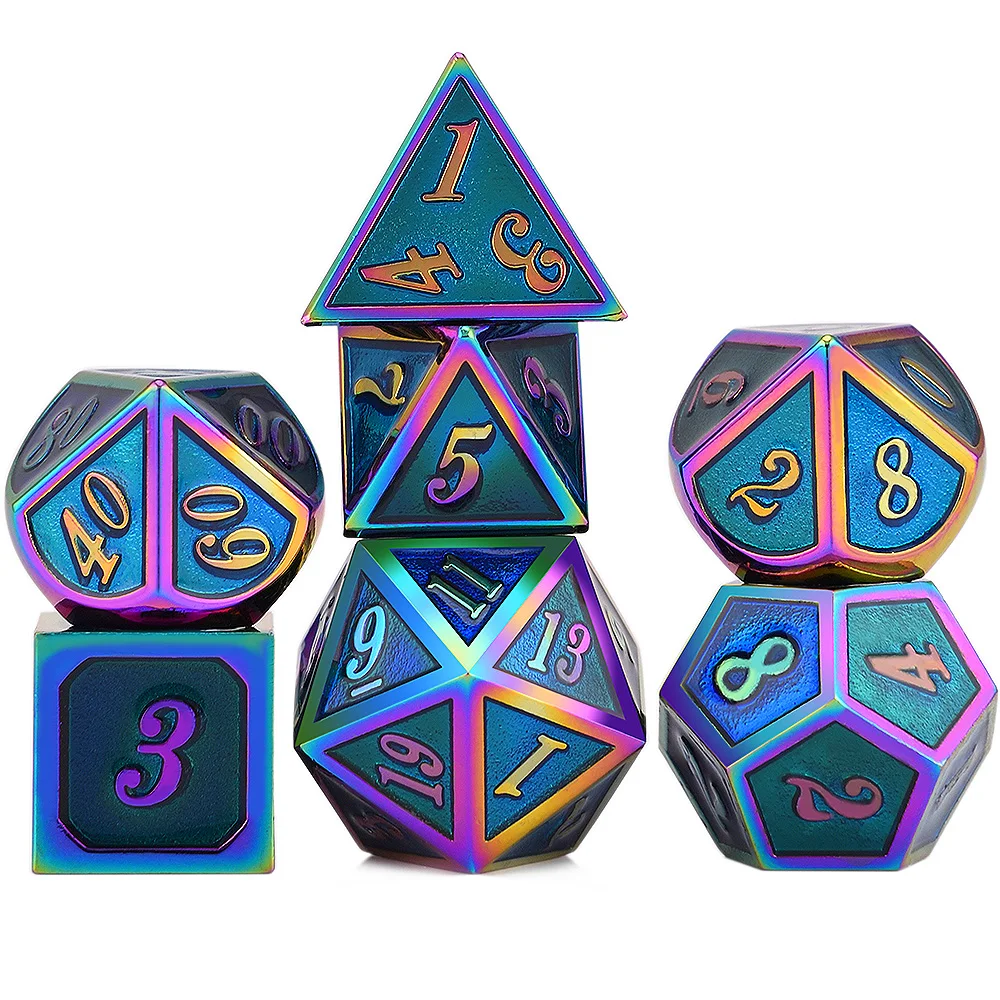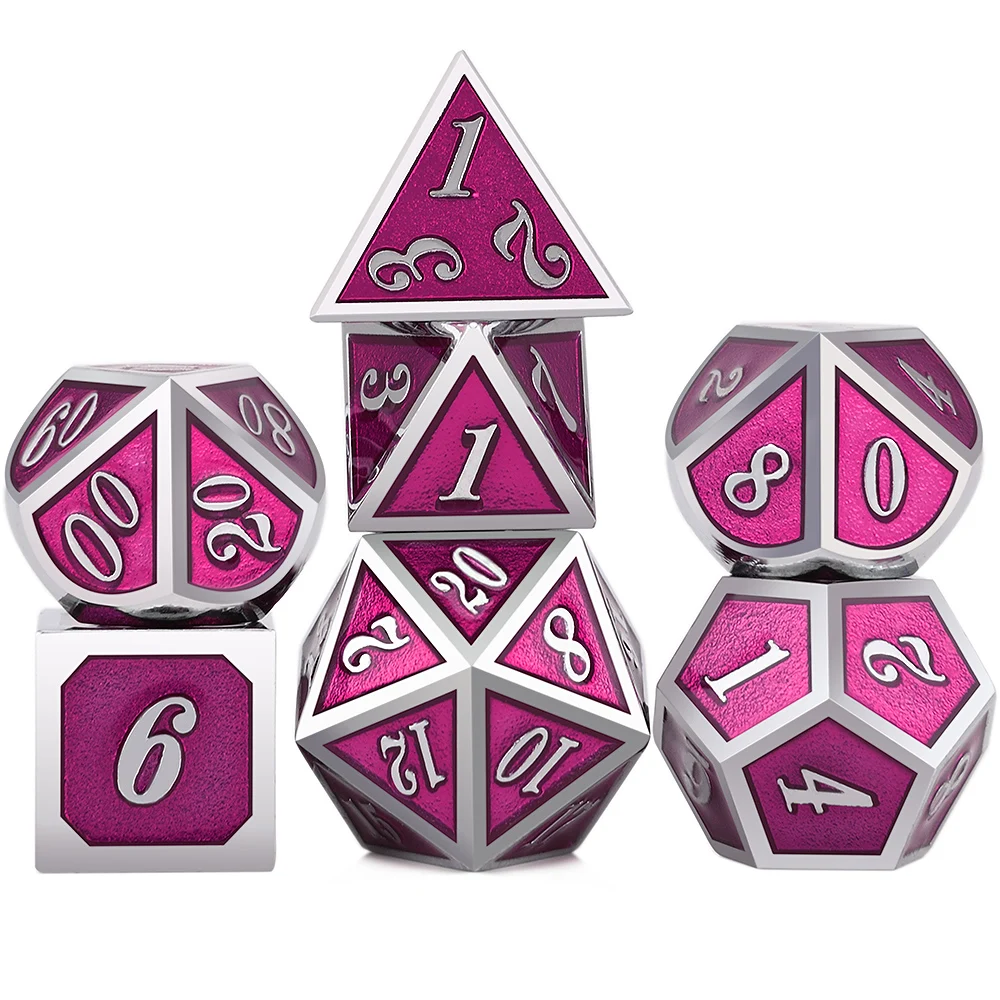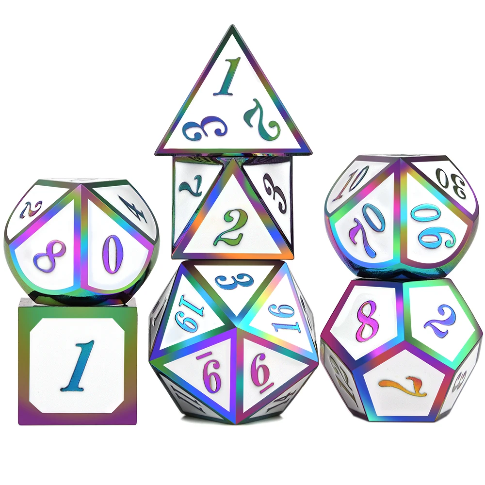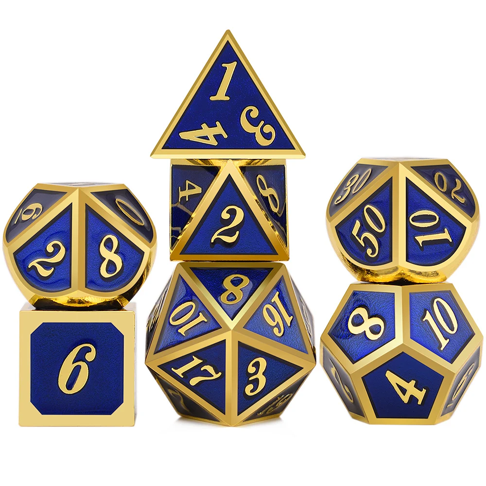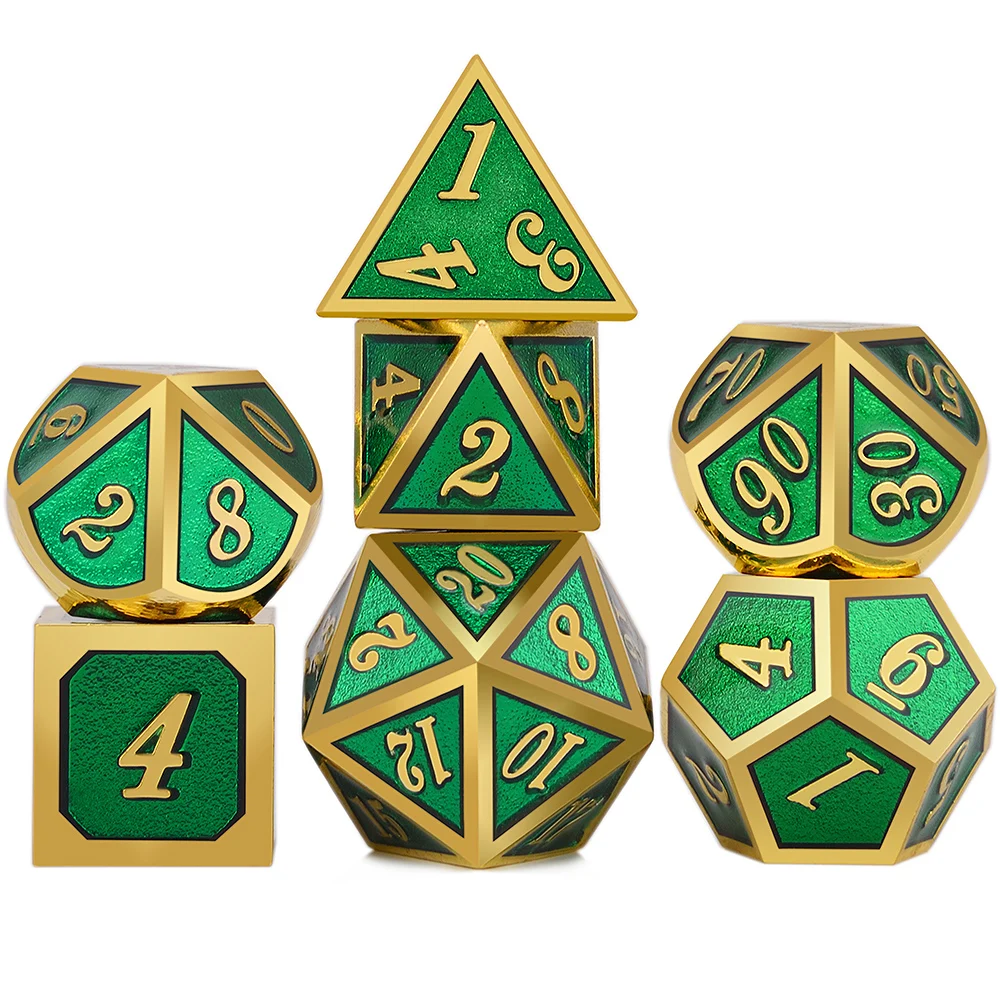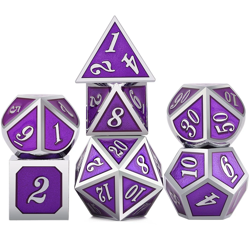 7 металлических многогранных костей содержит один D20, один D12, два D10 (00-90 и 0-9), один D8, один D6 и один D4.