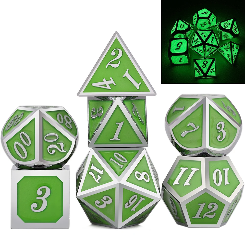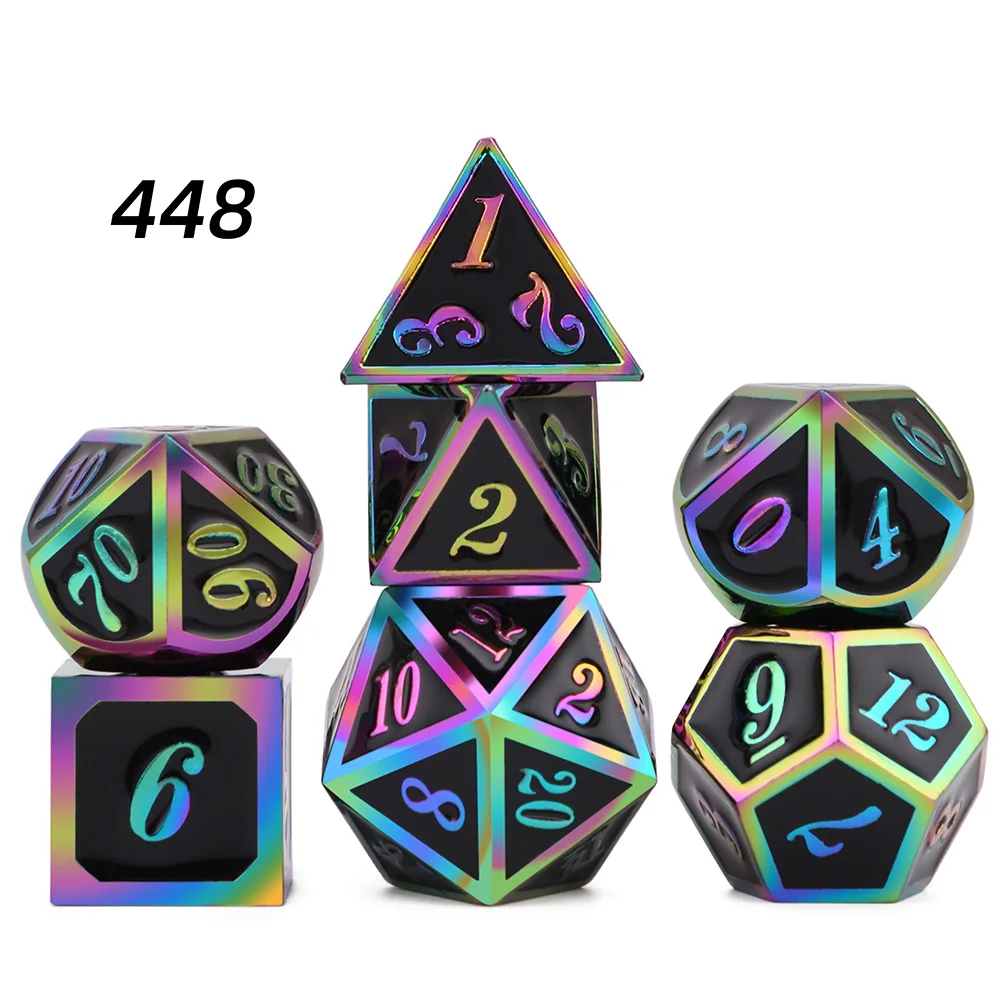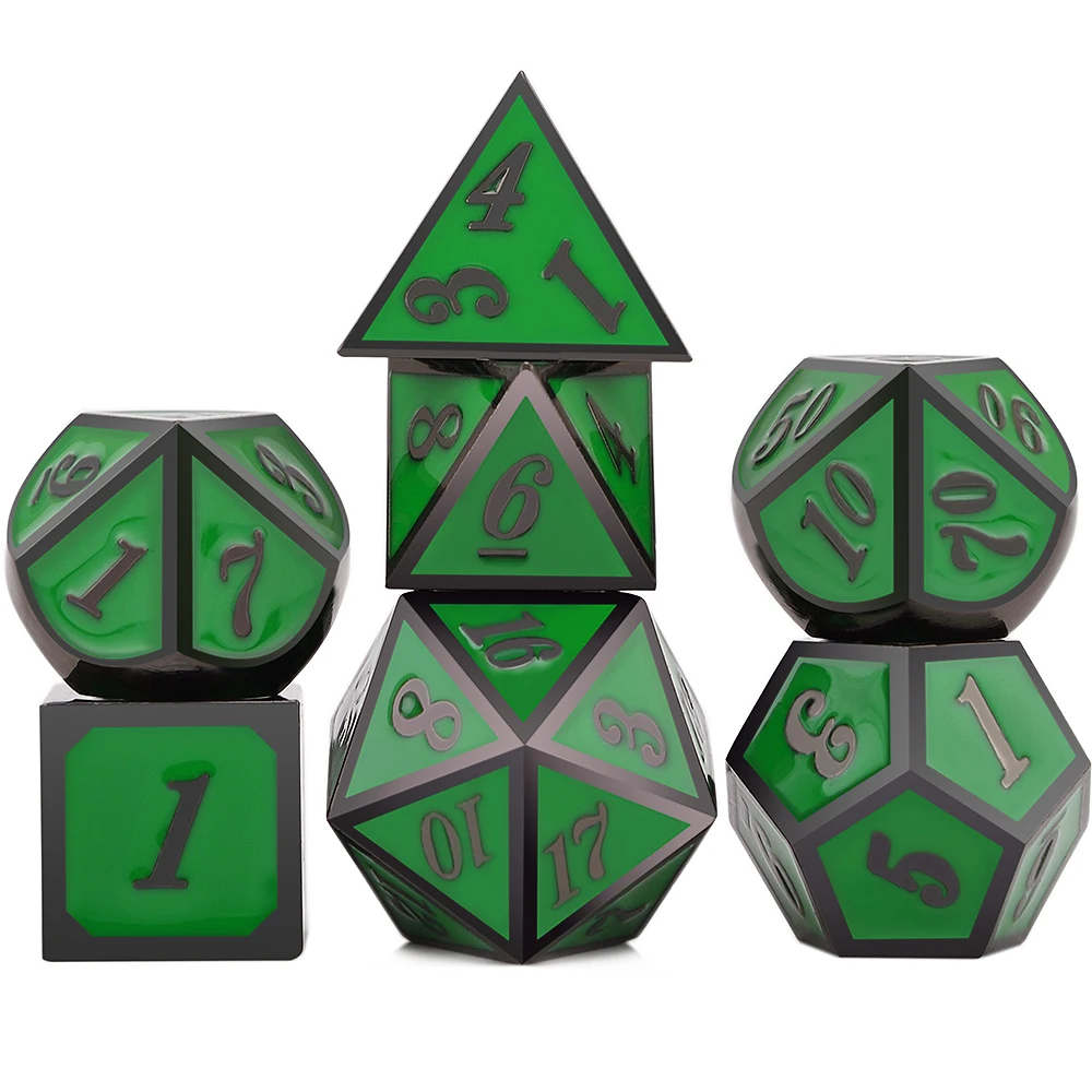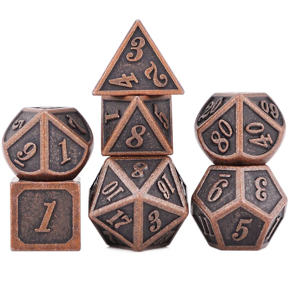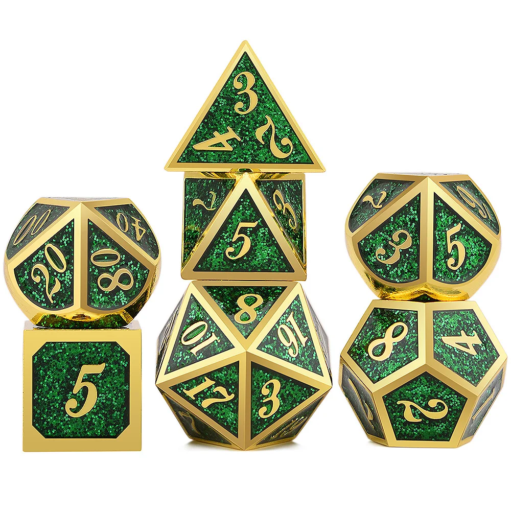 7 металлических многогранных костей содержит один D20, один D12, два D10 (00-90 и 0-9), один D8, один D6 и один D4.
