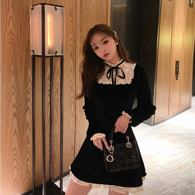 Французское винтажное платье с высоким воротником и кружевной отделкой, золотистое бархатное Черное женское платье с длинными рукавами, с высокой талией, платье в викторианском стиле, kawaii, готическое платье для девочек