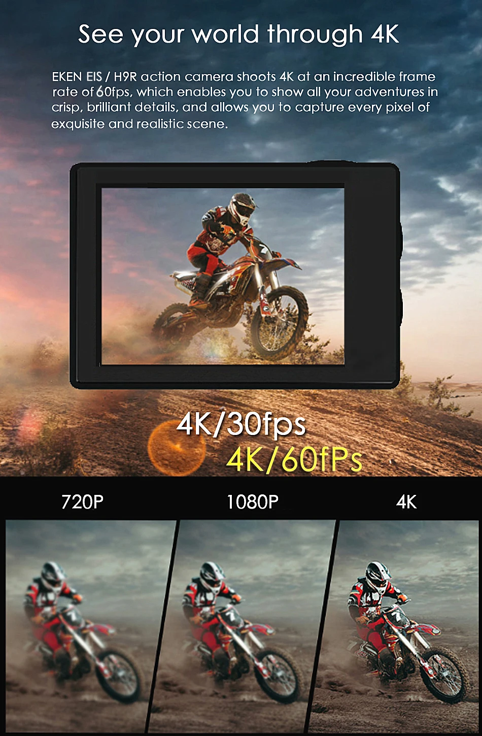 Экшн-камера H9R снимает 4K с невероятной частотой кадров в 60 кадров в секунду, что позволяет вам показать все свои приключения в четких, блестящих деталях, И позволяет запечатлеть каждый пиксель изысканной и реалистичной сцены.