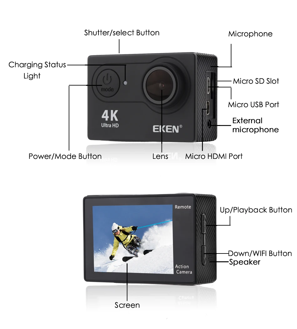 * 2,0 дюймов ЖК-дисплей экран * Водонепроницаемый корпус, который позволяет снимать увлекательные водные виды спорта; Водонепроницаемость до 30 метров под водой. * 12-мегапиксельный Широкоугольный объектив HD 170. * Диапазон управления Wi-Fi составляет 3 м. Поддерживается, приложение Android /ISO * Поддержка карт памяти до 128 ГБ максимум * Несколько форматов записи видео: 4K/2,7 K/1080p/720P * 4K/60fps, 4K/30fps, 2,7 K/30fps. Но большинство ПК принимает только видео 1080P. Поэтому мы предлагаем запись 1080P 60FPS, это лучший и наиболее свободный. * Поддержка электронной стабилизации изображения * Эту камеру можно использовать только с хорошей картой памяти класса 10.