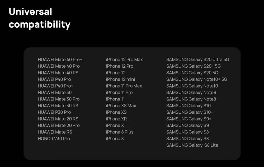 HUAWEI Mate40 RS, HUAWEI Mate40 Pro +, HUAWEI Mate40 Pro, HUAWEI P40 Pro, HUAWEI P40 Pro +, HUAWEI Mate 30, HUAWEI Mate 30 Pro, HUAWEI Mate 30 RS, HUAWEI P30 Pro, HUAWEI Mate 20 Pro, HUAWEI Mate 20 RS, RS, Honor V30 Pro, серия iPhone 12, Серия iPhone 11, серия iPhone X, серия iPhone 8, SAMSUNG Galaxy Note 8 ~ 10, SAMSUNG Galaxy S8 ~ 20 и другие мобильные телефоны, поддерживающие стандартную беспроводную зарядку Qi.