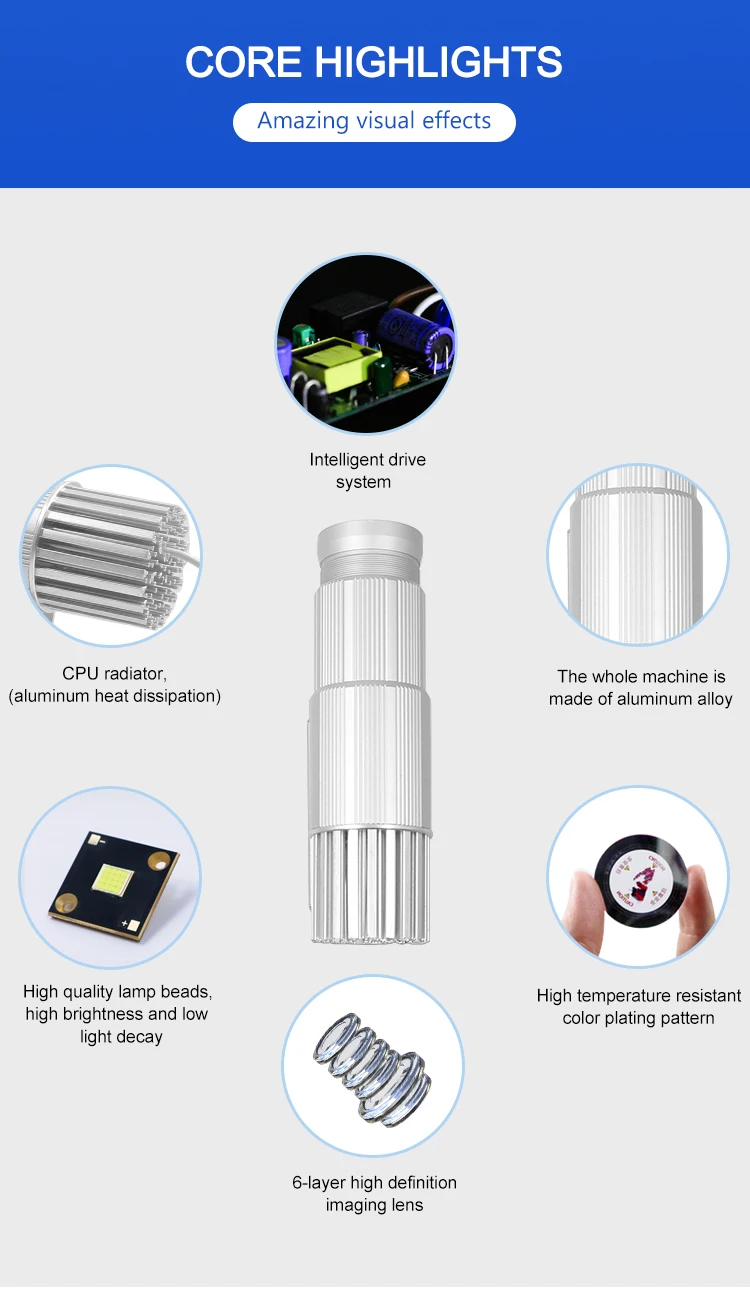 1. Yufan прямые продажи с фабрики, цена и качество гарантированы 2. Лампа для проектора с индивидуальным узором 3. Зеленый и экологически чистый, низкое энергопотребление 4. Различные узоры могут быть настроены в соответствии с потребностями пользователя. 5. Изготовлен из алюминиевого сплава, высокое качество и долгое время работы