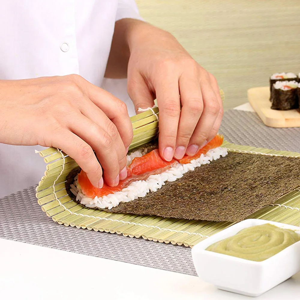 Изготовлен из 100% натурального бамбука, прочный, легкий, нетоксичный, без химических веществ. Твердый Бамбуковый Коврик для суши, сплетенный с хлопковой нитью и приклеенный, не просто разваливается. Не повреждает антипригарную и другую кухонную утварь. Простой в использовании, не требуется никаких сложных суши-машин, домашние суши должны иметь. Коврик для суши закатывается в аккуратный цилиндр для формирования риса, водорослей, овощей и морепродуктов, которые производят суши-роллы.