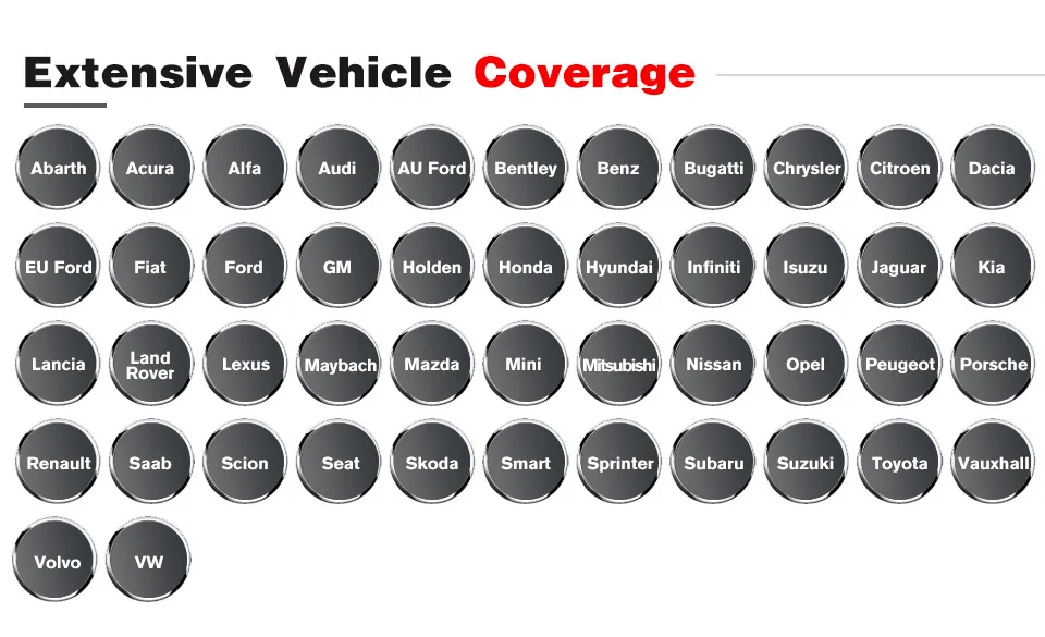 Abarth, Alfa, Audi, Bentley, Benz, BMW, Bugatti, Citroen, Dacia, EU Ford, Fiat, Jaguar, Lancia, Land Rover, Maybach, Mini, Opel, Peugeot, Porsche, renault, Saab, Seat, Skoda, Smart, Sprinter, Vauxhall, Volvo, VW