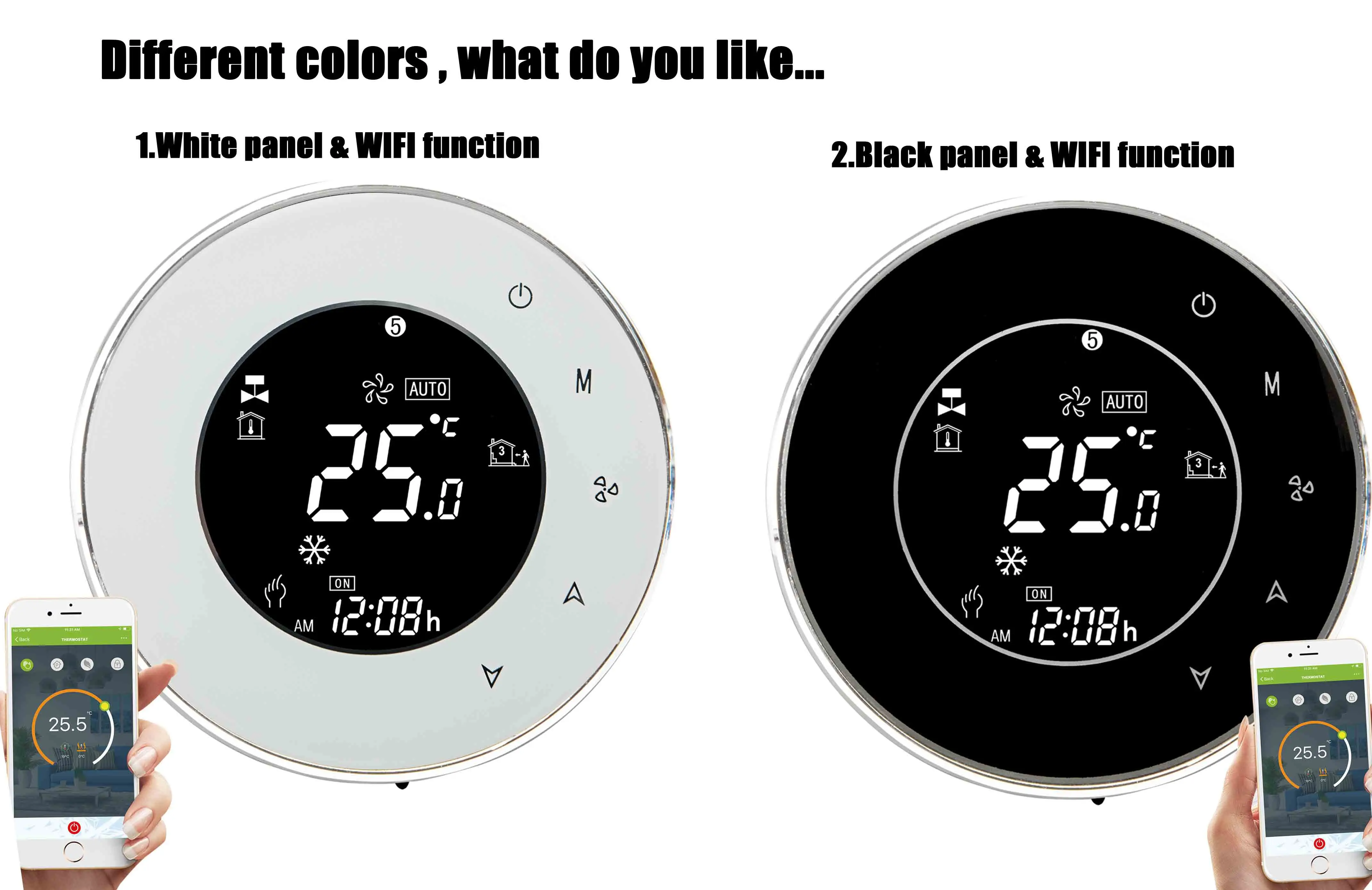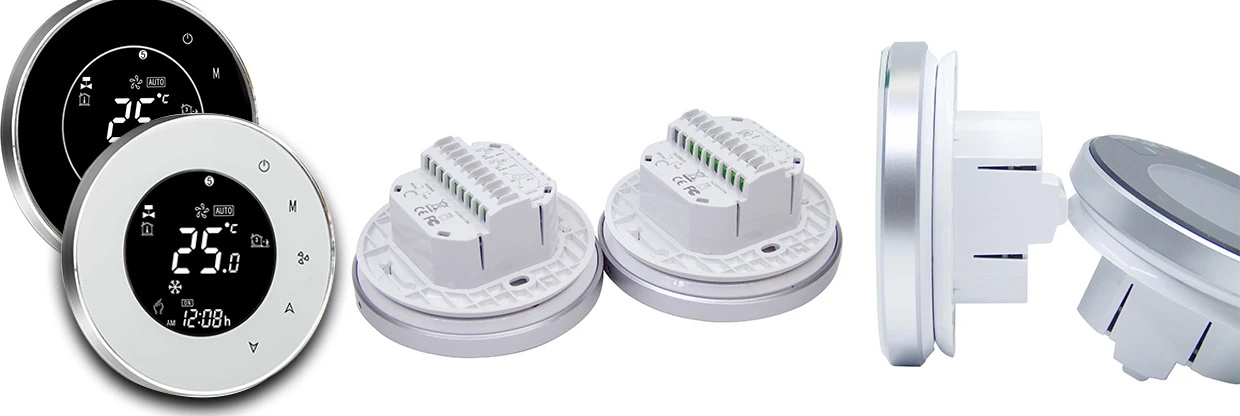 Круглый дизайн серии BAC-6000; Современные термостаты для сенсорного экрана для включения/выключения управления вентиляторами и клапанами в приложениях кондиционера с помощью сравнения комнатной температуры и температуры настройки. Как достичь цели комфорта и экономии энергии ваш мобильный телефон. Независимо от того, остаетесь ли вы дома или за границей, вы можете контролировать темп вашей комнаты. Легко.