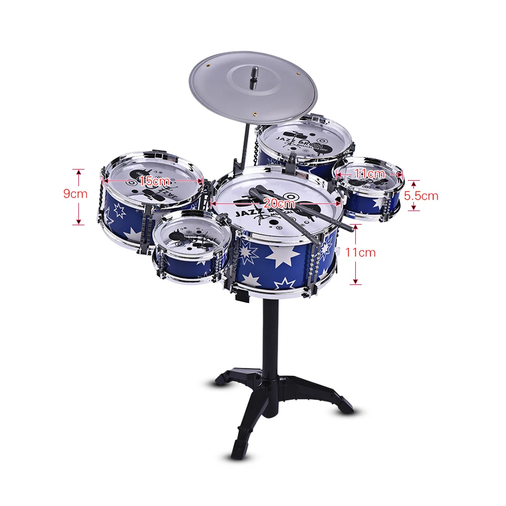 Включая 1 басовый барабан, 4 небольших барабана, 1 цимбал, 2 барабанные палочки и 1 небольшой стул.