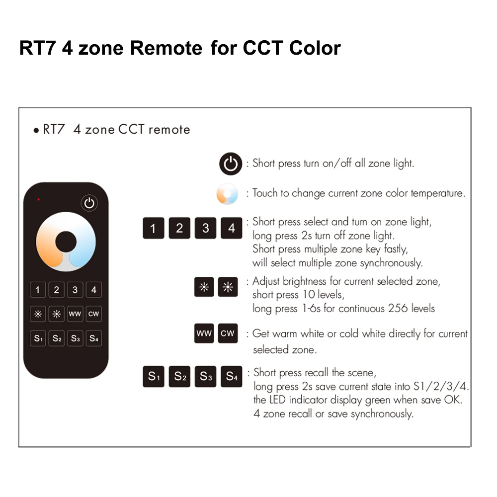 RT7: 4 зоны пульт дистанционного управления для WW/CW светодиодные ленты