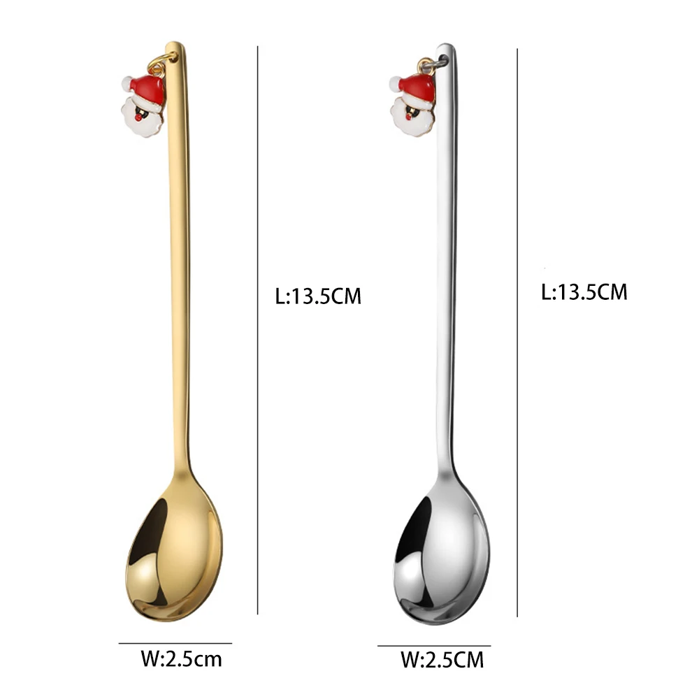 Product name: Christmas coffee spoon Color: gold, silver Approximate size: 13.5*2.5cm\nPackage include: 1Pcs Spoon Note: 1. Due to different measurement methods, there is a slight deviation, please understand! 2. Due to shooting light and display brightness is different, There is little deviation in color, please understand, thank you!