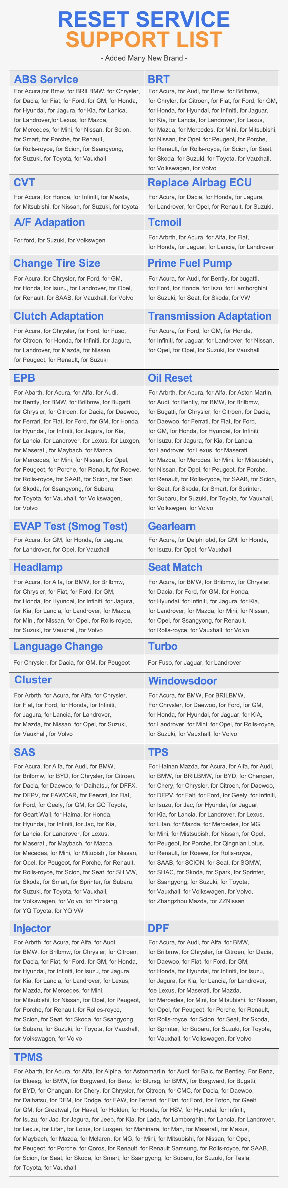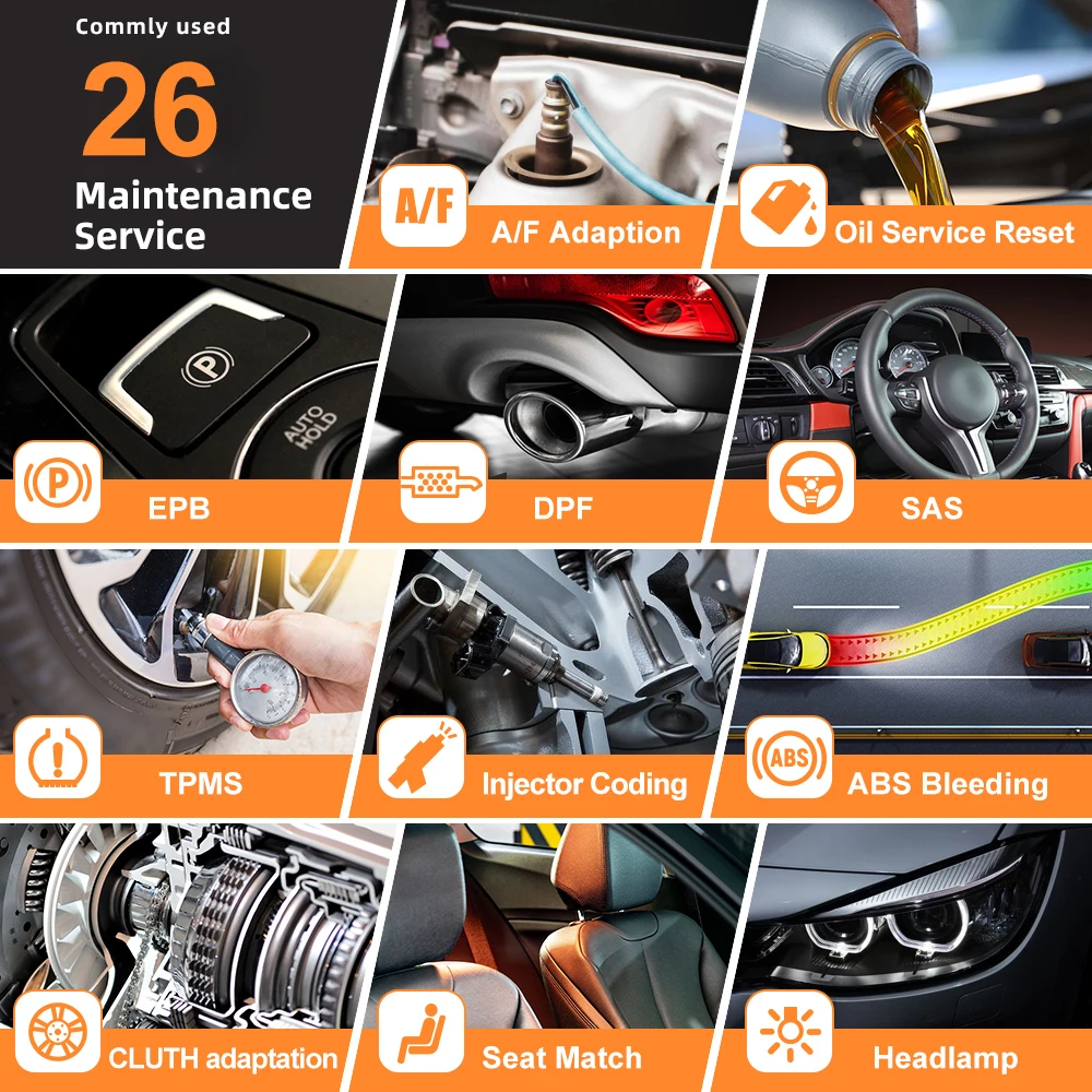2. Широкий охват транспортного средства: OBD2 Scan поддерживает модели 1996-2019, ABS/SRS Диагностика для более чем 58 автомобилей, сброс масла для более чем 49 автомобилей, сброс EPB для 42 автомобилей, DPF регенерация для 33 автомобилей, TBA для 30 автомобилей, SAS Калибровка для 41 автомобилей, TPMS адаптация для более чем 32 автомобилей, и т. Д. Дополнительные модели будут добавлены с обновлением.