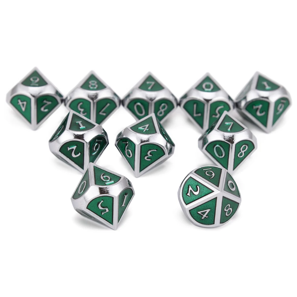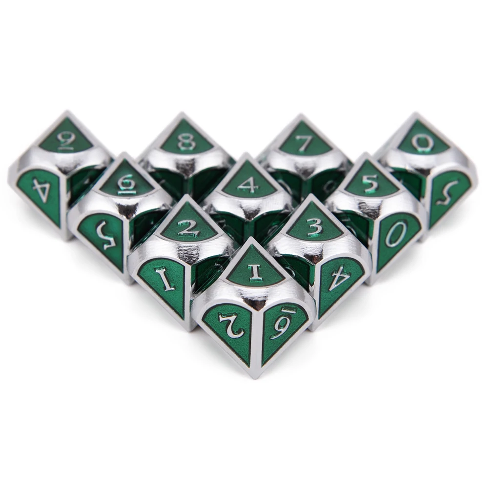 Этот набор игральных костей состоит из 10 кубиков D10 и изготовлен из твердого металла и имеет приятный вес.