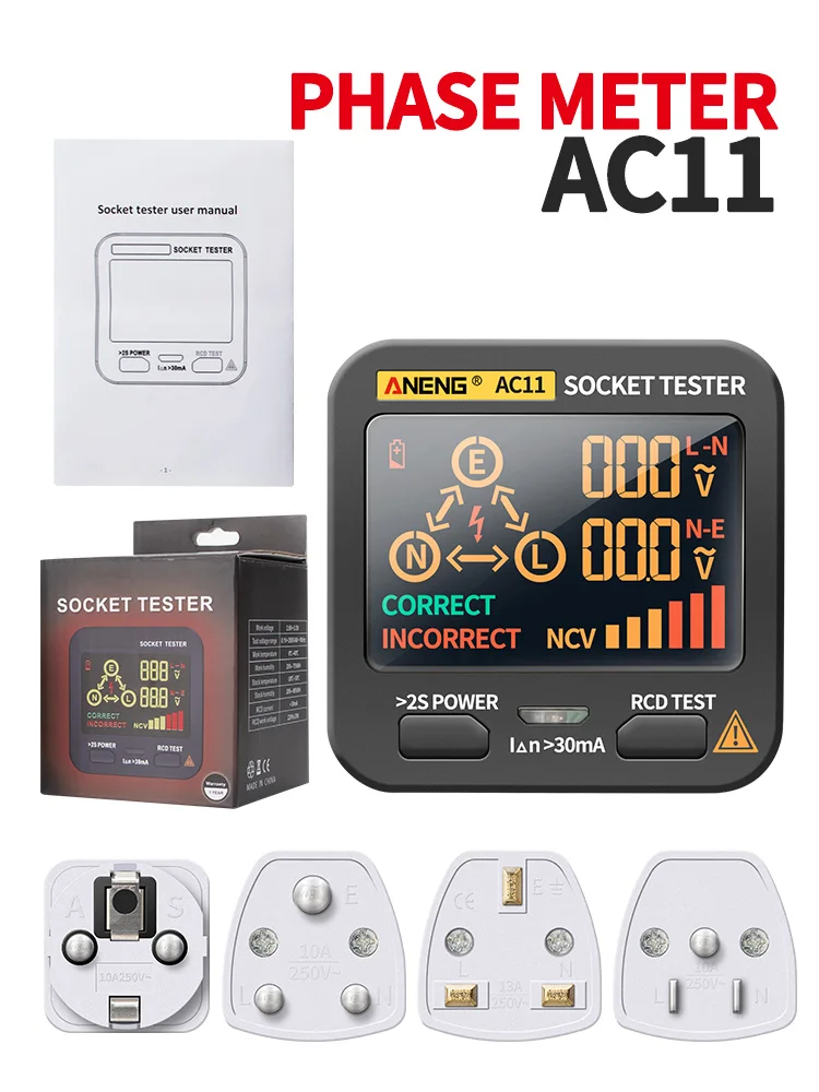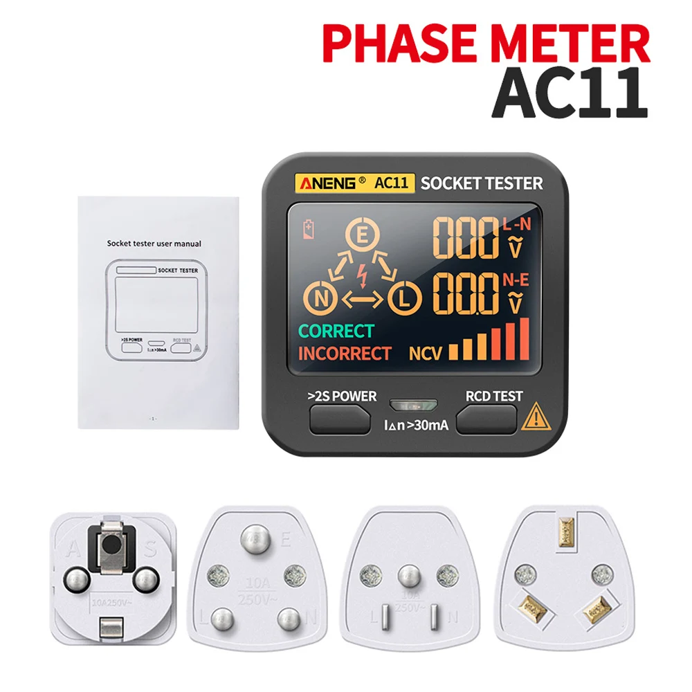 Этот умный тестер розеток ANENG AC11 в основном используется для определения полярности силового сокера и безопасности выключателя утечки. Он может быстро и точно обнаруживать нейтральный провод заземления, утечку, поездку, напряжение розетки и проводку розетки, а затем одновременно отображать результаты на светодиодный ном экране.