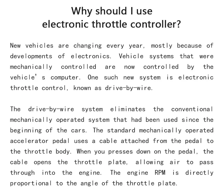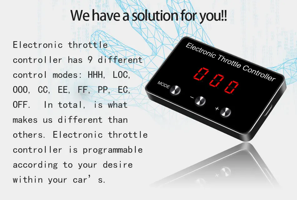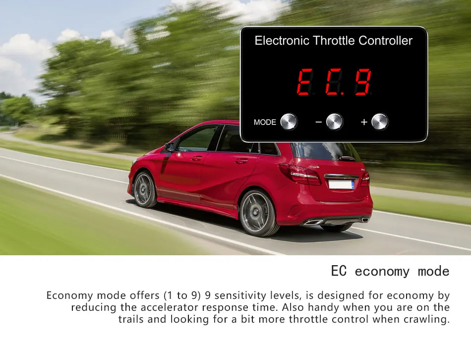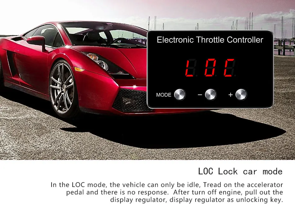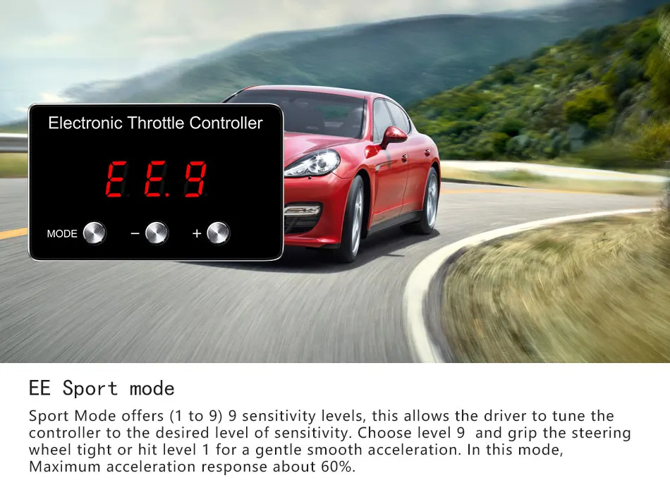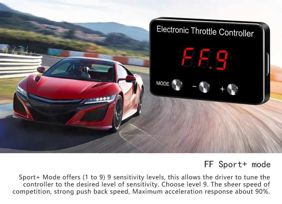 Режим HHH (экономичный режим ускорения) В режиме экономического ускорения нет необходимости в регулировке, снижают расход топлива во время ускорения. Режим LOC (режим блокировки автомобиля) В режиме LOC транспортное средство может находиться в режиме холостого хода, протекать на педаль акселератора, и ответа нет. После выключения двигателя, вытяните регулятор дисплея, регулятор дисплея в качестве разблокировки Режим ООО (режим автоматического управления) Автоматический режим управления автоматически регулирует чувствительность контроллера в соответствии с условиями вождения, идеально подходит для тех, кто хочет установить и забыть. Отлично подходит для вождения в городе. Автоматическое управление-это то, что делает уникальное Режим CC (городской режим) Городской режим предлагает (от 1 до 9) 9 уровней чувствительности, это позволяет драйверу настроить контроллер на желаемый уровень чувствительности. Выберите уровень 9. Максимальное улучшение отклика на ускорение около 30%. Режим EE (спортивный режим) Спортивный режим предлагает (от 1 до 9) 9 уровней чувствительности, это позволяет драйверу настроить контроллер на желаемый уровень чувствительности. Выберите уровень 9 и плотно закрепите рулевое колесо или уровень 1 для мягкого плавного ускорения. В этом режиме максимальный отклик на ускорение составляет около 60%. Режим FF (спорт + режим) Спорт + режим предлагает (от 1 до 9) 9 уровней чувствительности, это позволяет драйверу настроить контроллер на желаемый уровень чувствительности. Выберите уровень 9. Высокая скорость соревнований, высокая скорость назад, максимальное ускорение около 90%. Режим PP (гоночный режим) Режим Racing mode предлагает (от 1 до 9) 9 уровней чувствительности, это позволяет драйверу настроить контроллер на желаемый уровень чувствительности. Выберите уровень 9. Исключительная скорость соревнований, сильная скорость отжима назад, чувство полета за рулем, рекомендуется использовать на аренах, максимальное ускорение отклика около 120%. Режим EC (экономичный режим) Экономичный режим предлагает (от 1 до 9) 9 уровней чувствительности, предназначен для экономии за счет уменьшения времени отклика ускорителя. Также удобно, когда вы находитесь на тропе и ищете немного больше управления дроссельной заслонкой при ползании. Режим выключения (нормальный режим) Возвращает транспортное средство к стандарту