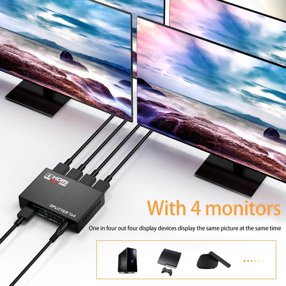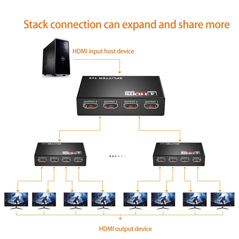 1 1,1x2, x4, Divisor hdmi e um cubo flexivel para varios monitores. Ele pode conectar dois ou mais alocadores hdmi para formar um alocador maior. 2. O Divisor hdmi pode conectar an entrada da fonte de sinal hdmi ao Divisor com um Unico cabo HDMI (que precisa ser comprado separadamente). 3. Este Divisor HDMI Suporta Sinais de Audio E video.