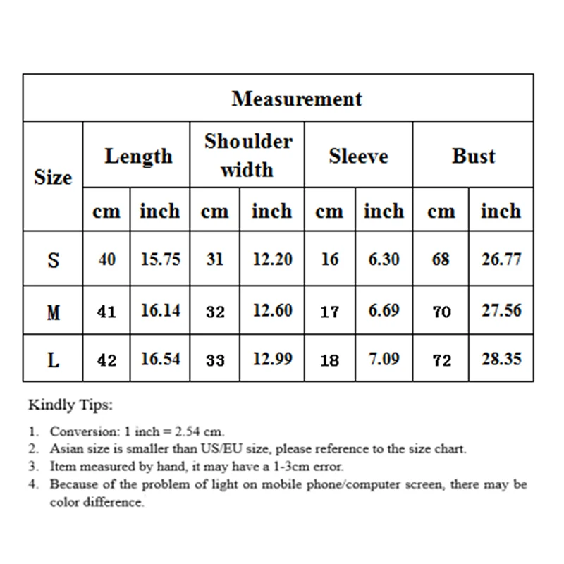 1. Пожалуйста, внимательно проверьте таблицу размеров перед покупкой товара. Если вы не знаете, как выбрать размер, пожалуйста, свяжитесь с нашей службой поддержки клиентов. 2. Замеры сделаны вручную, поэтому возможны отклонения на 2-3 см. (1 см = 0,39 дюйма, 1 дюйм = 2,54 см) 3. Выберите больший размер, если ваш размер между двумя размерами. О цвете: Как вы знаете, разные компьютеры отображают цвета по-разному, Цвет товара может немного отличаться от изображения.