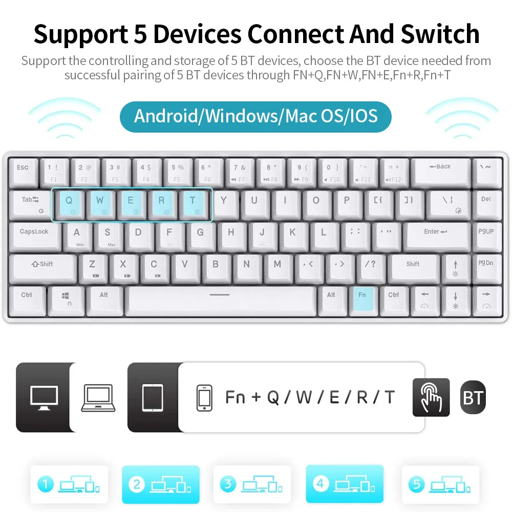 Поддержка управления и хранения 5 устройств BT, выберите устройство BT, необходимое для успешного сопряжения 5 устройств BT через FN + Q,FN + W,FN + E,Fn + R, ФН + т.