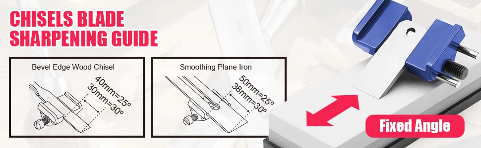 Углы заточки могут быть точными, чтобы установить с помощью заточки джиг путем регулировки проекции инструмента. Если проекция долота 30 мм для углов 30 ° и 40 мм для углов 25 °, плоское железное Проецирование 38 мм для углов 30 ° и 5 0 мм для углов 25 °.