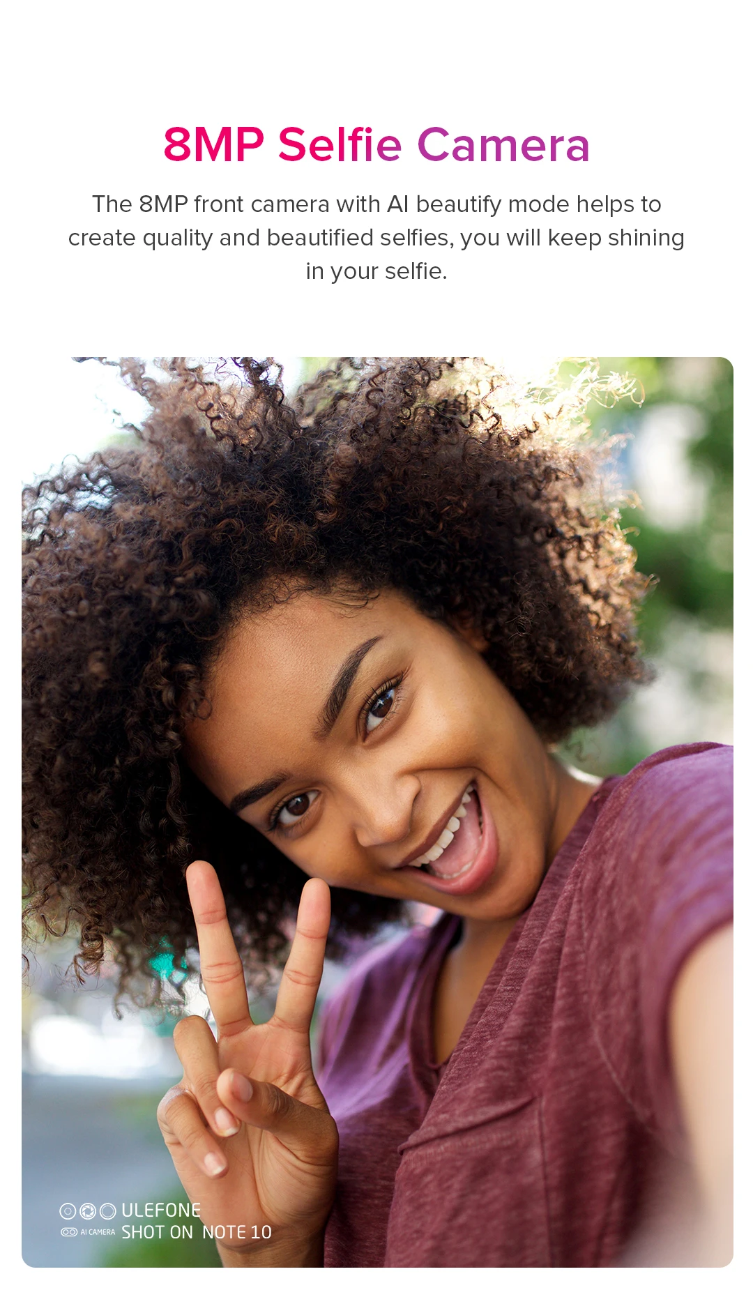 Больше сюрпризов с Ulefone Note 10. Он поставляется с тройной камерой на задней панели, включая главный датчик 8 Мп, макрообъектив и датчик глубины. Основной датчик 8 Мп позволяет запечатлеть яркие и четкие изображения в вашем путешествии; Макро-камера может захватывать захватывающие, супер крупным планом фотографии, в то время как датчик глубины позволяет в режиме реального времени оптическое размытие, таким образом, вы можете легко запечатлеть всю красоту богатых сцен.