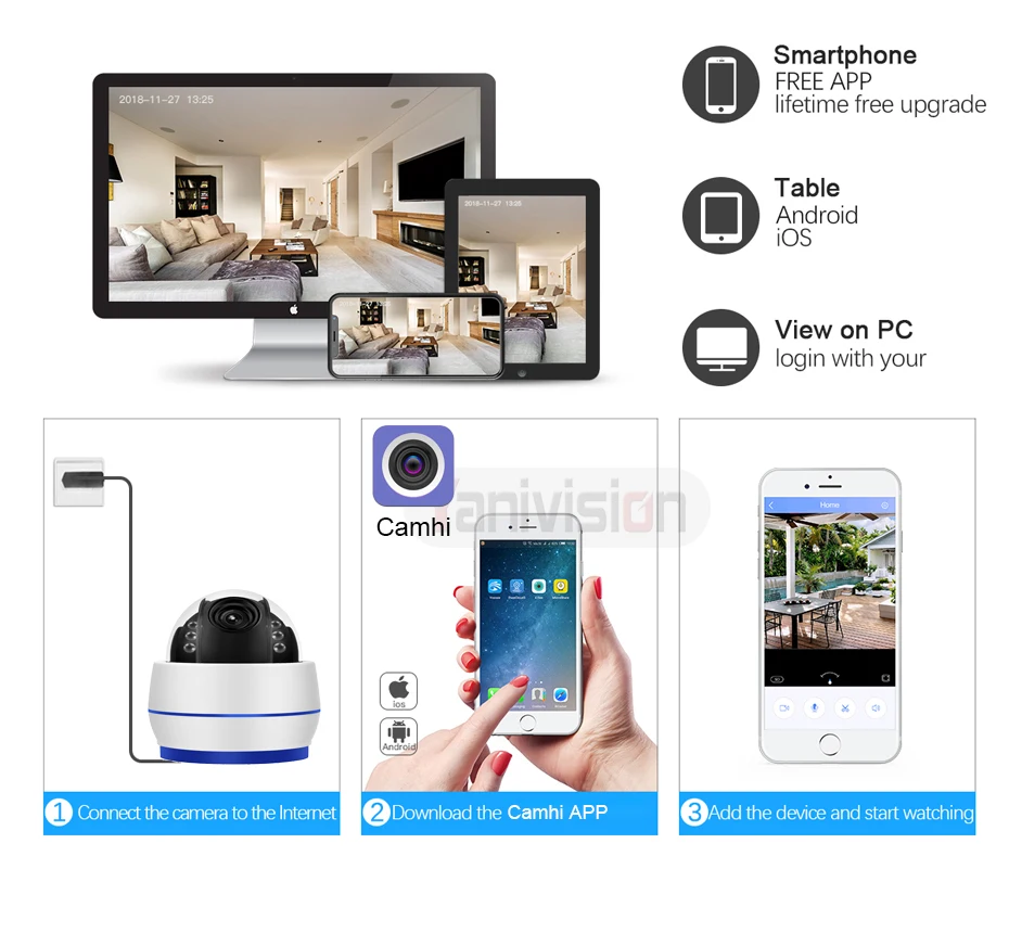 Простота установки, простота в использовании; Подключи и работай Поддерживает 2,4 ГГц Wi-Fi и подключения к локальной сети, независимо от того, где вы находитесь, вы можете удаленно получить доступ к камере, чтобы увидеть прямые трансляции и оставайтесь на связи. Удаленно просматривайте камеру с помощью приложения на мобильных устройствах IOS и Android.