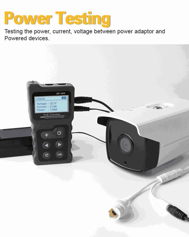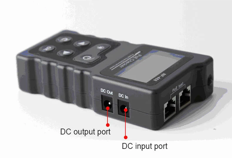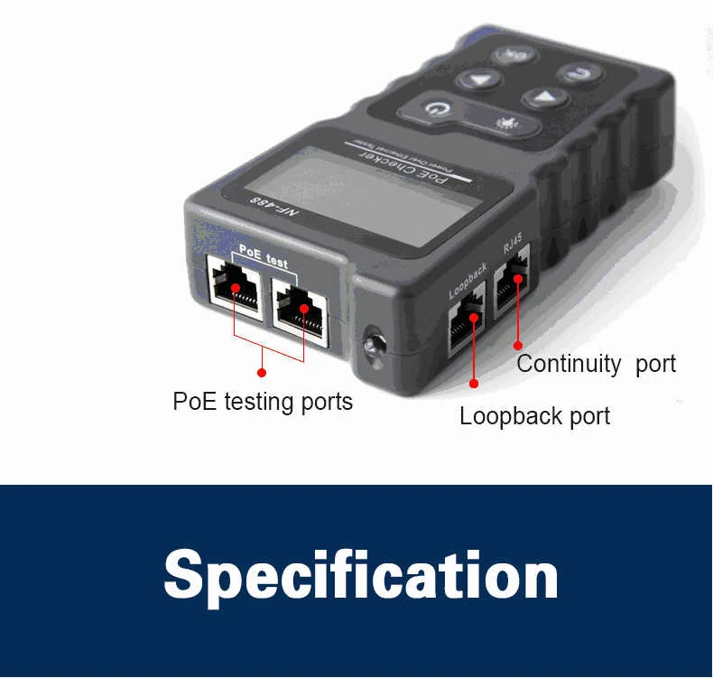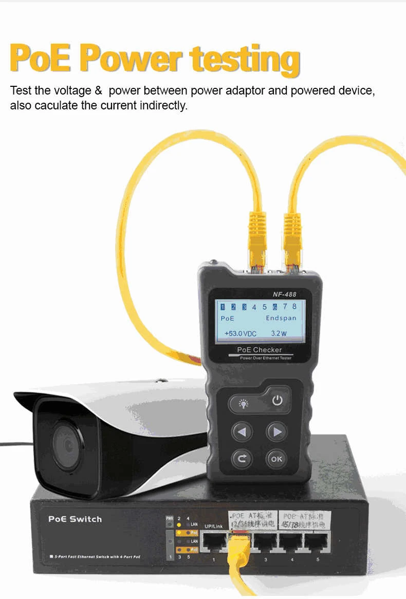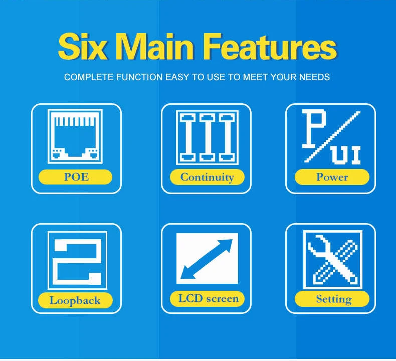 Main Functions · Test the information of the standard PoE device, such as af\at standard, power supply voltage, power supply polarity, and crossover mode. · Identify the supply voltage, power supply polarity, and crossover mode of non-standard PoE devices. · Check the short circuit, crossover and open circuit status in the network cable with the far end. · Test the power consumed by DC appliances. . The loop-back test function of the switch.
