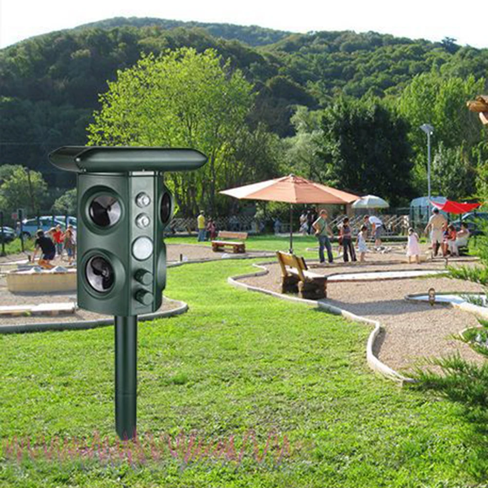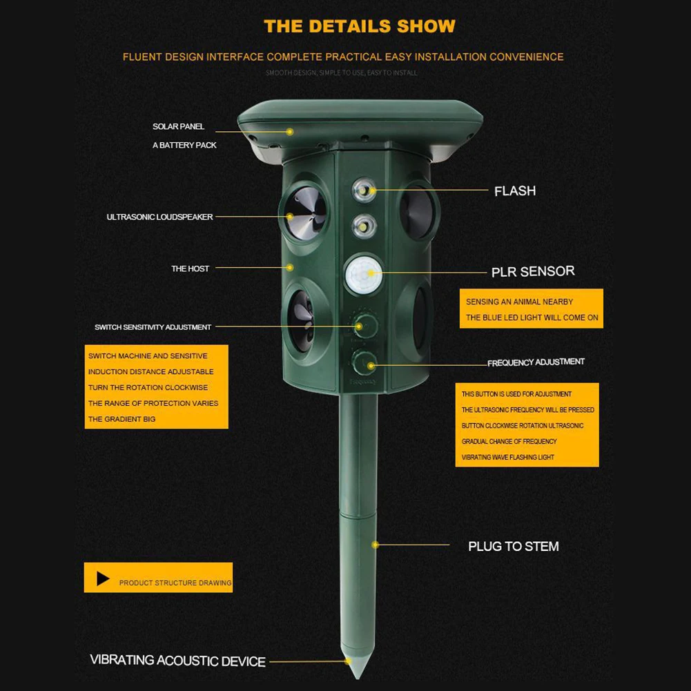 -Powerful four-tone ultrasound drives away animals. When the animal enters the area, the infrared sensor detector is triggered, and the product emits ultrasonic waves to make the animal feel uncomfortable and escape the area.