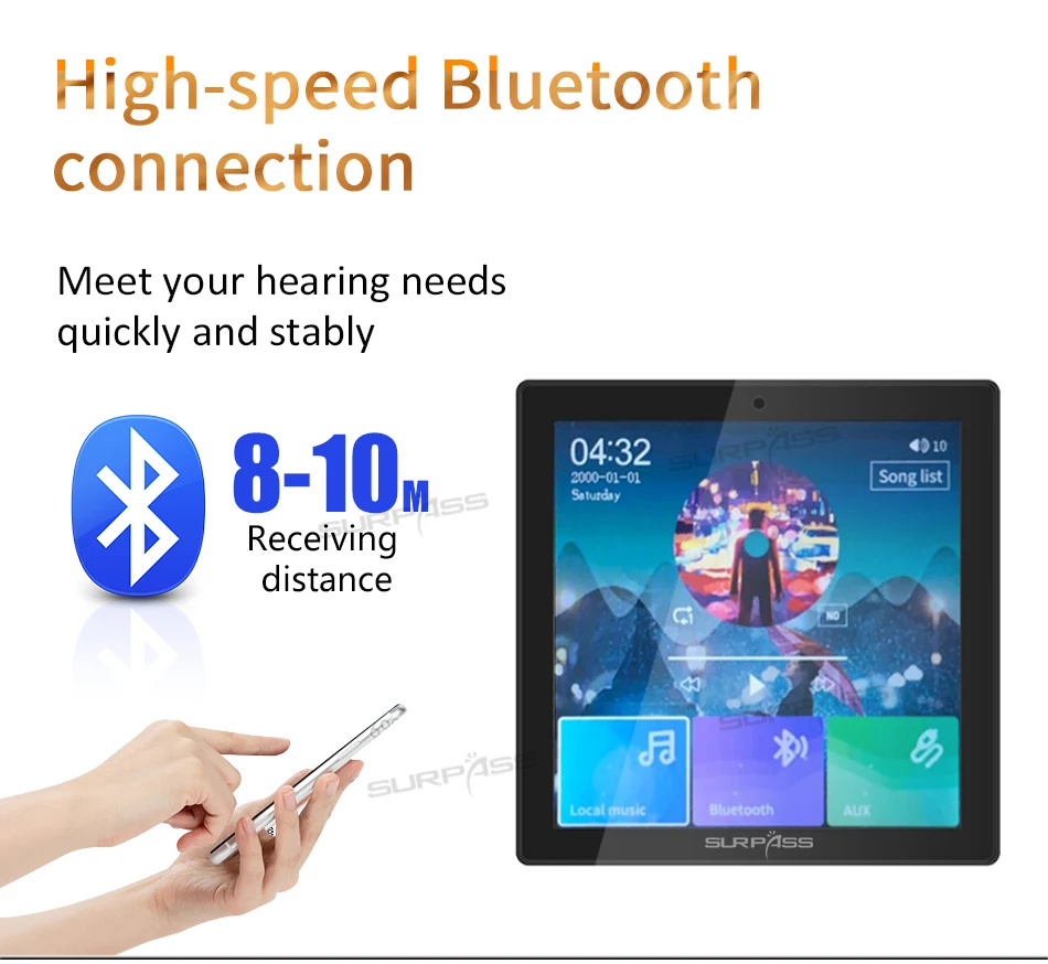 Технология беспроводного подключения Bluetooth. Вы можете передавать музыку со смартфона, планшета, компьютера на устройство и передавать звук через потолочные колонки. Вы можете контролировать громкость вашего устройства в руке. С изменяемым именем и паролем Bluetooth, вы можете установить в близкой области, но без путаницы с именем при сопряжении.