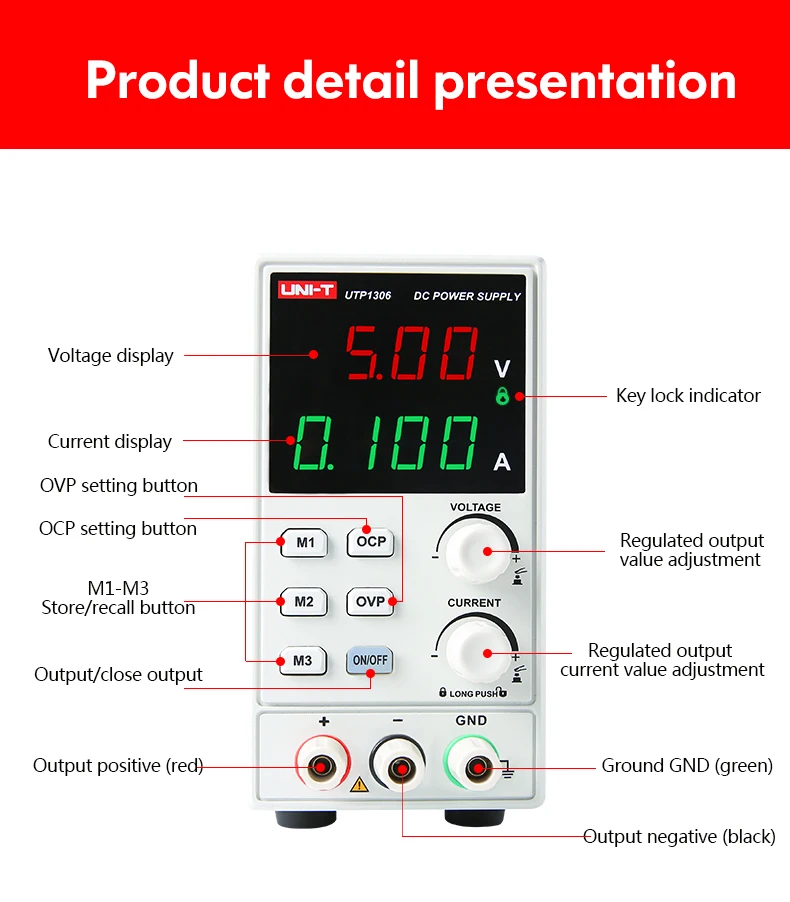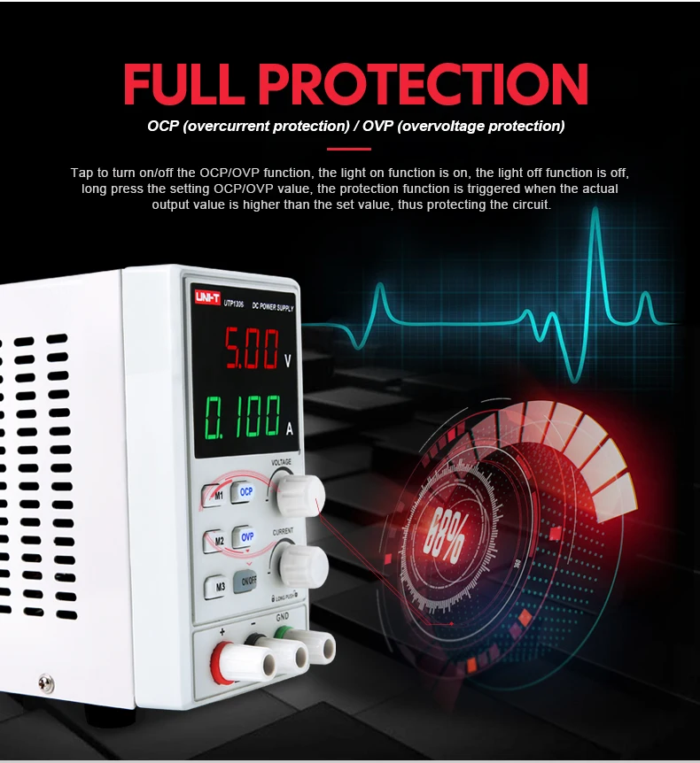 Серия блоков питания постоянного тока UTP1306S-это одноканальные линейные блоки питания постоянного тока с низким уровнем пульсации/шума, защитой от перегрузки и функциями постоянного напряжения/тока.
