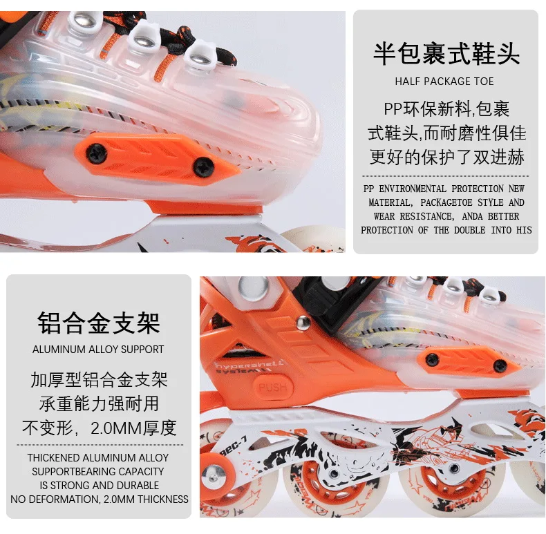Колесо изготовлено из прочного и эластичного полиуретана 85A; Рама изготовлена из сплава серии M7 с ЧПУ; Подшипник гладкий и менее устойчивый; Этот коньки используется для профессионального соревнования по конькам;