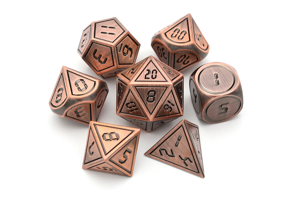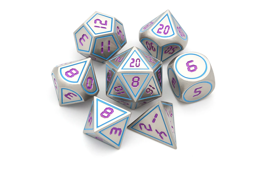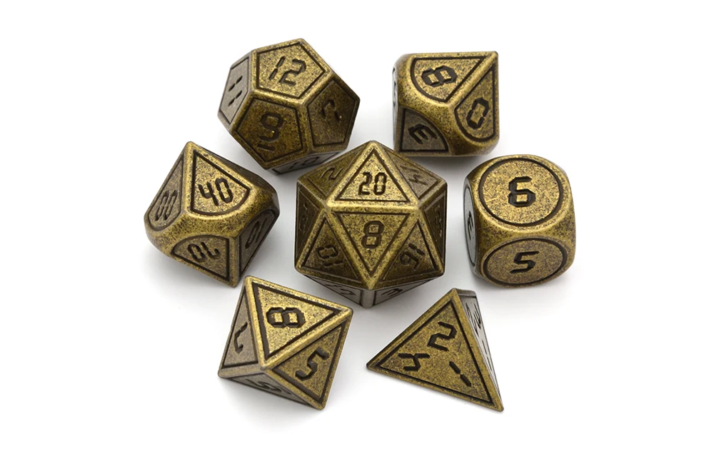 7 металлических многогранных игральных костей содержит один D20, один D12, два D10 (00-90 и 0-9), один D8, один D6 и один D4.