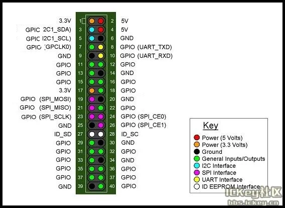 40 контактный разъем: GPIO (x28) и мощность (+ 5 В, + 3,3 В и GND). Некоторые I/O Pin Используется для конкретных функций, как UART, I2C, SPI или PWM