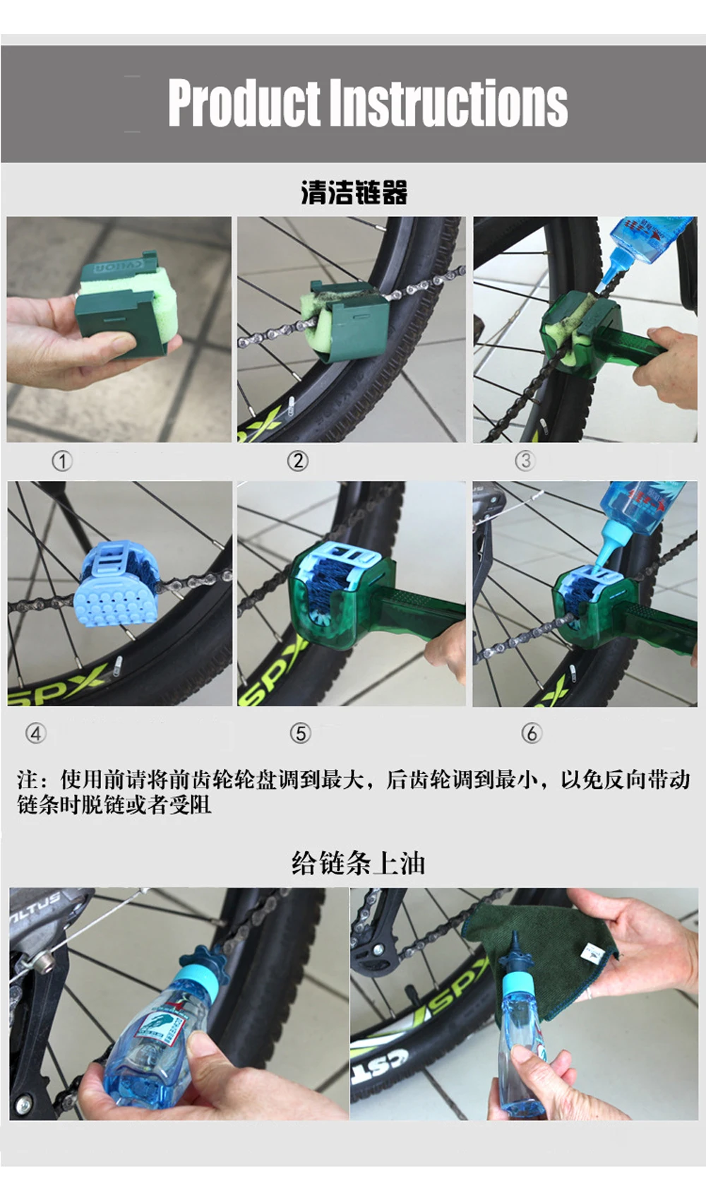 Модель: P02-01 Материал: пластик часть формы: очиститель цепи, мягкая щетка, губка, полусерповидный крючок, чистящая щетка маховика Особенности: простая структура, простота в использовании, чистый эффект хороший, прочный, многофункциональный.