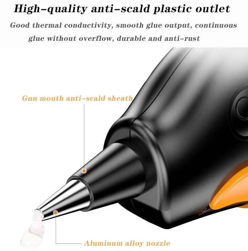 【 3 】 дизайн по центру пользователя: клеевой пистолет оснащен компонентами нагревателя с положительным коэффициентом температуры (PTC) для защиты от перегрева. Безопасный выключатель питания, Эргономичный захват и светодиодный индикатор делают высокотемпературный клеевой пистолет безопасным, удобным и простым в использовании.