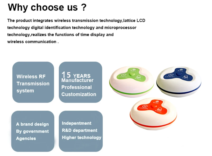 Мы являемся ведущим производителем беспроводных систем paging в Китае и работаем в этой области уже 15 лет. Удовлетворение потребностей каждого клиента-наша миссия. Покупайте у нас, наслаждайтесь лучшим послепродажным обслуживанием!