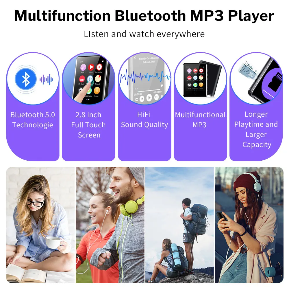 • Большой сенсорный экран 2,8 дюйма -- Высокочувствительное сенсорное управление, легко управлять, скользя пальцем. -- Улучшенная визуальная производительность для электронных книг, воспроизведения видео и т. Д. • Повторное соединение через Bluetooth 5,0 -Поддержка воспроизведения музыки через bluetooth-наушники/колонки -Беспроводное соединение и свободные руки • Более длительное время воспроизведения и большая емкость -Аккумулятор 500 мАч внутри, 30-50 часов прослушивания музыки (проводные наушники) -- 16 Гб внутреннего хранения -Поддержка расширения tf-карты (Максимум 128 ГБ) • Качество звука HiFi без потерь -Интеллектуальная технология шумоподавления с помощью профессионального чипа -- Поддержка APE / FLAC / MP3/ WMA / WAV / DRM / ACELP и т. Д. • Встроенный шагомер и динамик -Очень подходит для спорта, фитнеса, бега, путешествий и т. Д. • 28 видов языков Английский/русский/французкий/испанский/немецкий/Португальский/Корейский/японский и т. д.