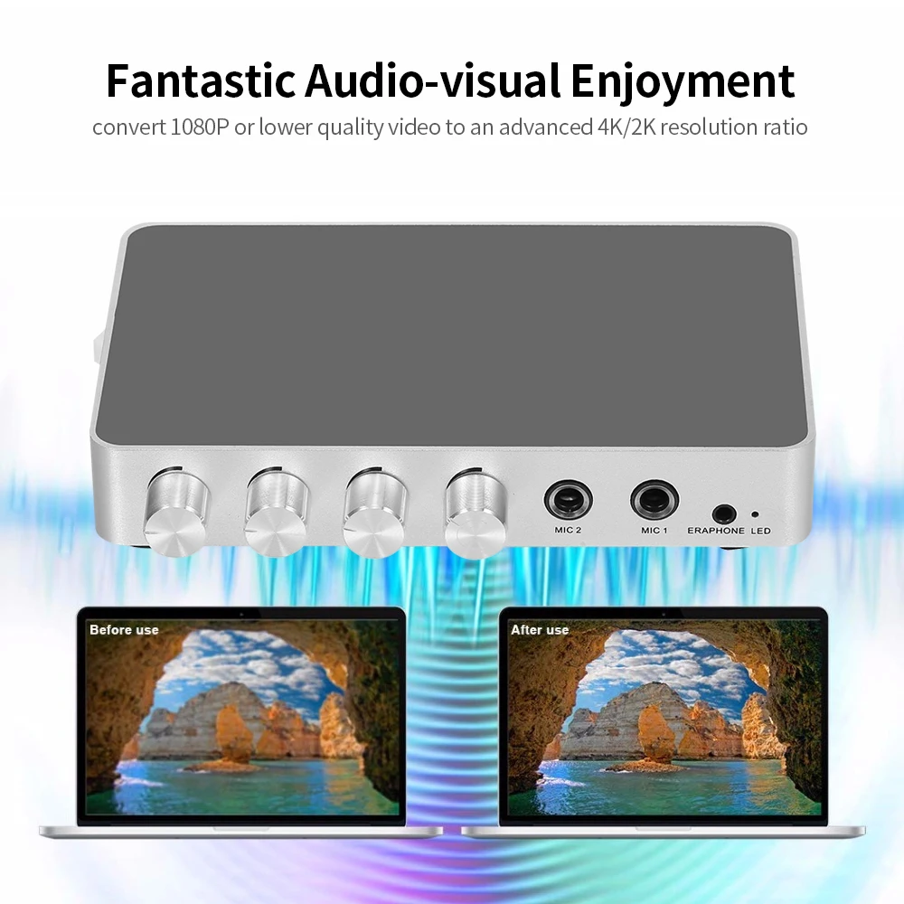 Караоке-микшер отлично работает со скалером 4K/2K и может преобразовывать видео 1080P или более низкого качества в расширенное соотношение разрешения 4K/2K, которое обеспечивает совершенно различный аудио-визуальный опыт.