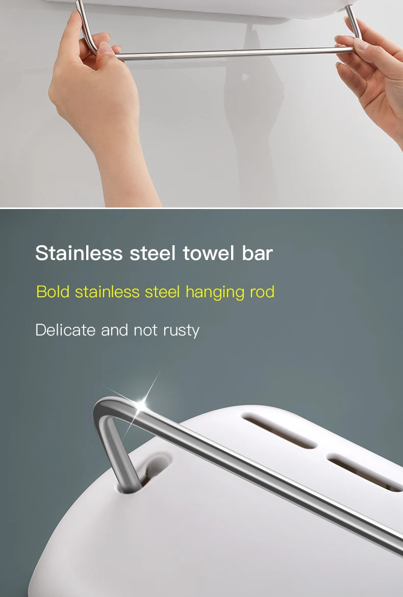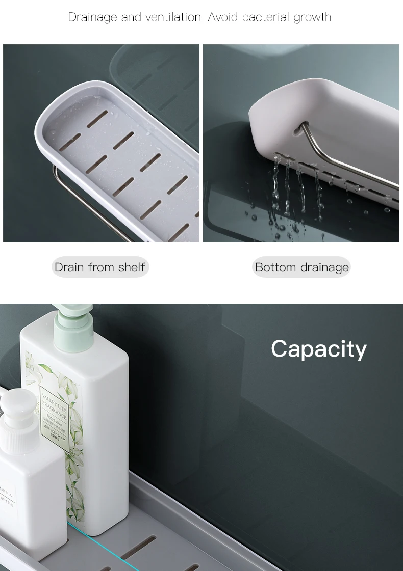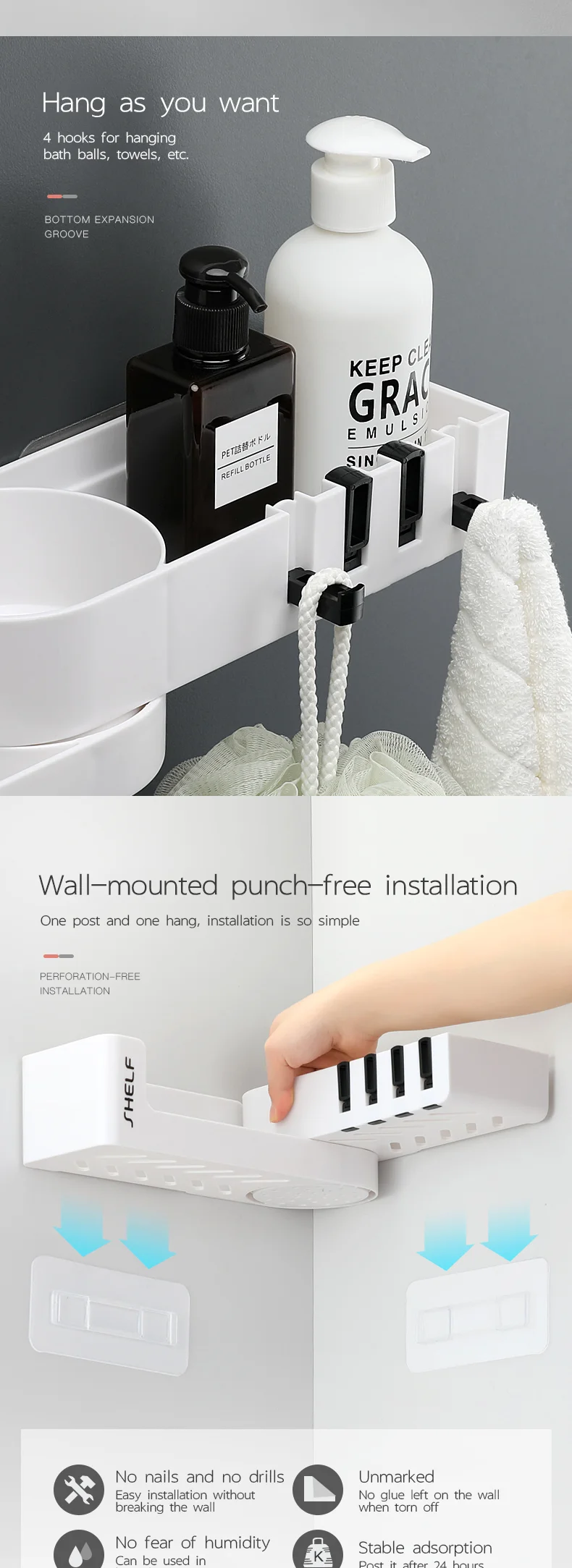 Особенности 1. Изготовлено из высококачественного АБС-материала, стеллажей для ванной комнаты, экономит пространство для ванной комнаты, дизайн слива. 2. Настенная вешалка для полотенец для ванной комнаты, без гвоздей и без сверл, без пасты, сильная несущая способность 3. Ванная комната является хорошим помощником, высокая ценность, подходит для всех видов украшения ванной комнаты.