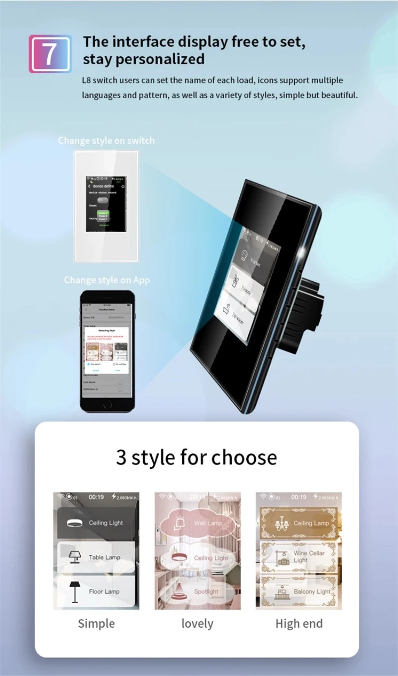 Интеллектуальный выключатель света имеет функцию сенсорного ЖК-экрана для отображения дополнительной информации и настройки. На экране отображается такая информация как время, энергопотребление. Вы можете настроить значок переключателя, название и общую тему в соответствии с вашими предпочтениями.