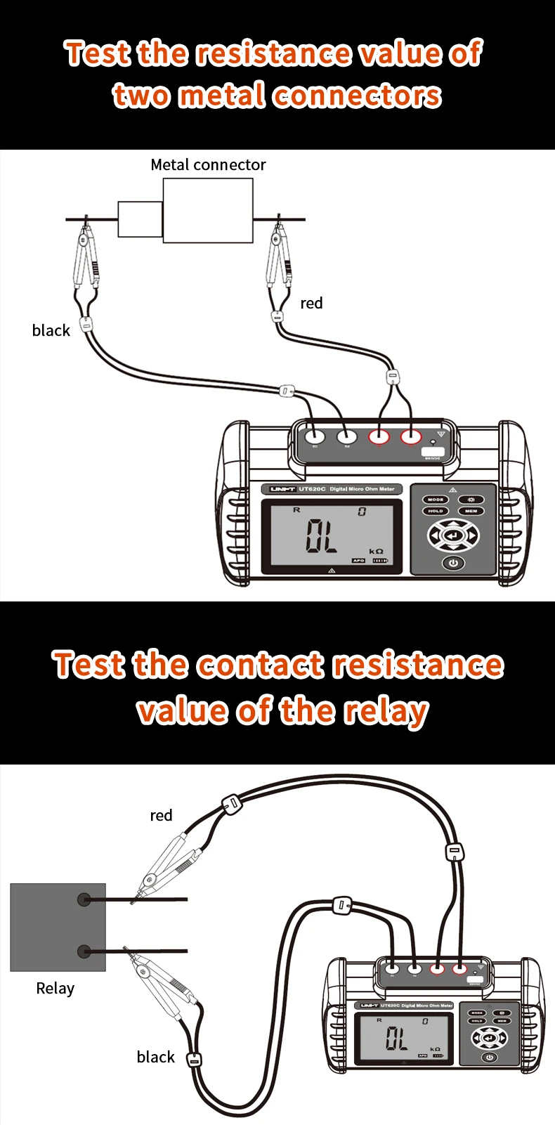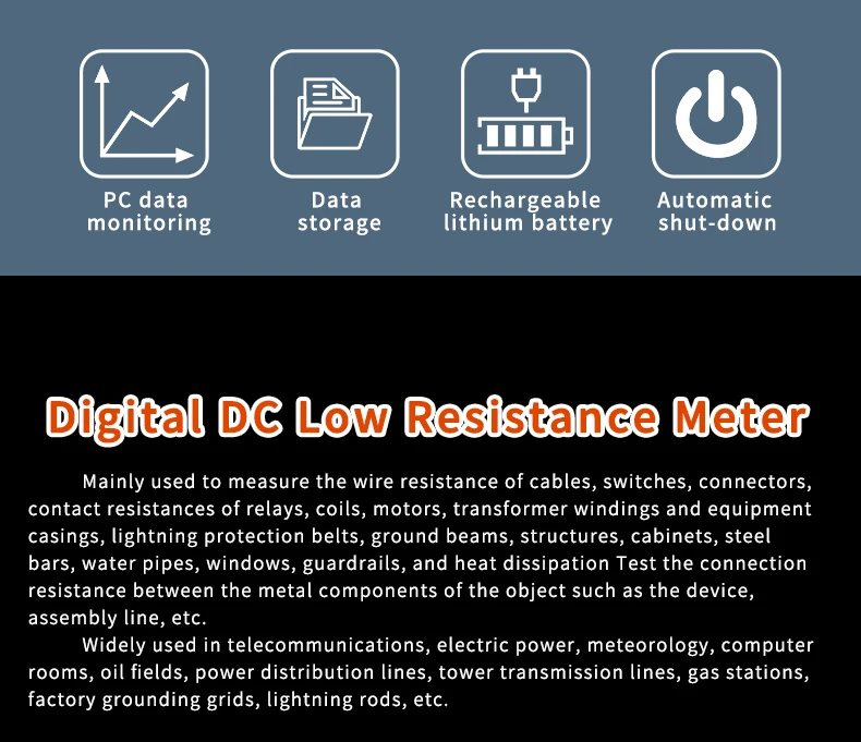 В основном используется для измерения сопротивления проводов кабелей, контактного сопротивления переключателей, соединителей, реле, сопротивления катушек, моторов, обмоток трансформатора и сопротивления заклепок металла, тест на сопротивление соединению между металлическими компонентами, тест на сопротивление низкому значению, сетку заземления и испытание на сопротивление заземляющего электрода соединительного проводника, Тест на сопротивление контакта и т. Д.